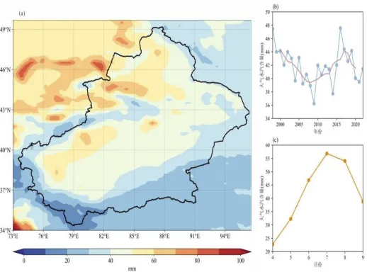 1998年到2022年间,在每年4到9月(即北半球夏季生长季,气温最高、蒸发最强烈的半年),新疆平均每平方米土地会蒸发掉135毫米左右的水, 而新疆总面积166万平方公里,把这些加起来,每年蒸发的水汽总量大得吓人。
