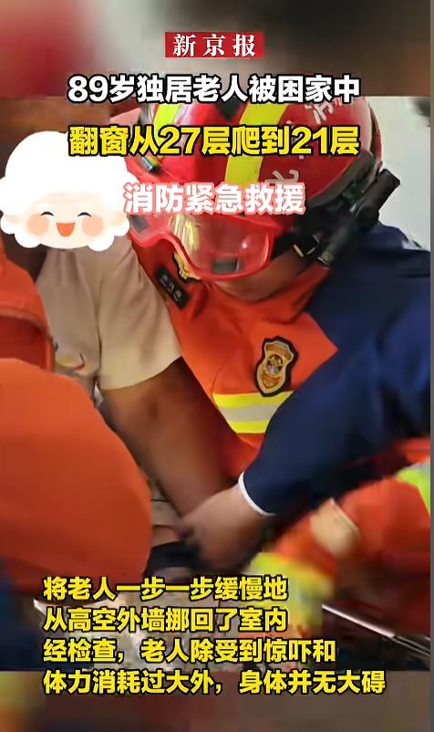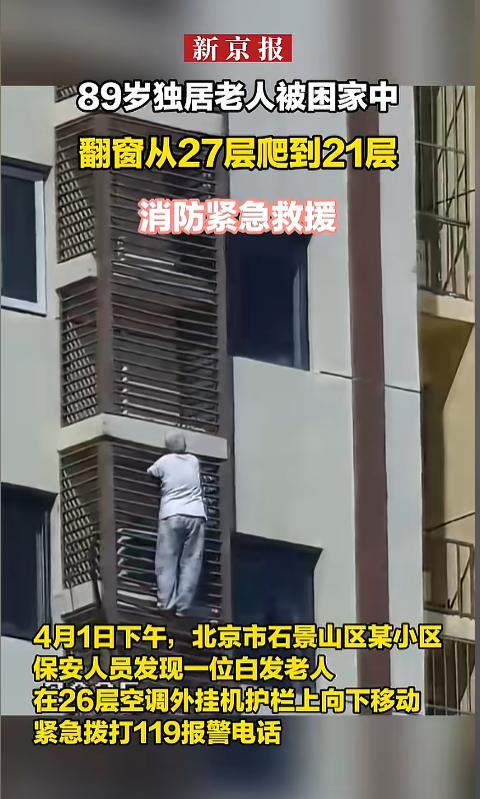 “太吓人了!”4月1日,北京,一位89岁老人把自己反锁在了卧室里,偏偏手机还不在身边,联系不上人。老人情急之下,竟然从窗户中爬了出去,试图从空调外机平台爬下去,结果被困在了21楼。网友:89了还有这身手,佩服! 据媒体报道,这位老人平常自己一个人住,就住在27楼。事发当天,她不小心把自己反锁在了卧室里。好巧不巧的,手机还在外面,自己也没办法联系别人。老人实在是急了,头脑一热,竟然做出了惊人的举动。 她打开了卧室的窗户,爬到了空调平台上,也顾不上害怕了,从27楼高的位置,借着空调平台的格栅,一点点爬了下去。可是毕竟年纪大了,刚爬到21楼,自己就体力不支,爬不动了。 这时候,小区巡逻的保安正好经过,看见老人被挂在楼上,摇摇欲坠,可把他们吓坏了,赶紧打了119报警。 很快,消防员就到了现场,他们从楼上窗户那儿,先给老人绑上了安全绳,又用多功能担架,一点点的把老人挪进了屋里。事后检查,老人身体并无大碍,只是受到了惊吓,体力消耗过大。 网友看后表示,89岁,从27楼爬到21楼,还是空中,到底谁是老太太。也多亏了百叶窗质量好,没开裂。不过,这事儿了千万不能学,别拿性命开玩笑! 遇到这种情况,优先是喊人,然后敲地面,找人求救。除此之外,还可以把身边的床单之类的,伸出窗外,借此来求救! 信息来源:《89岁独居老人被困家中,翻窗从27层爬到21层》新京报
