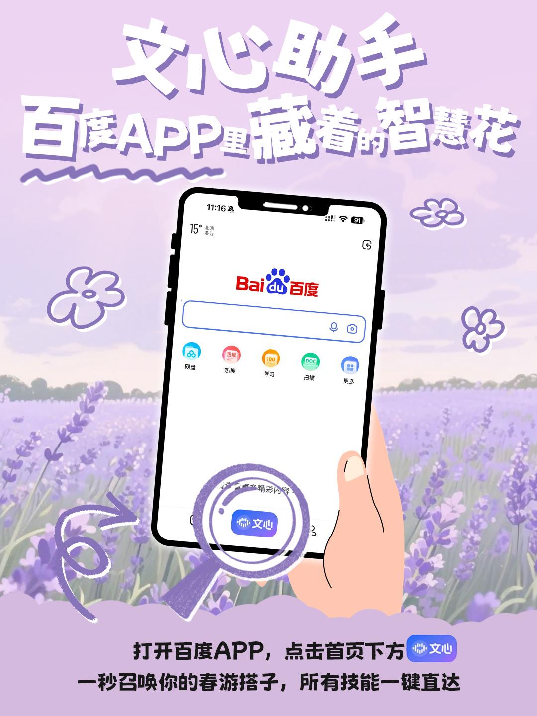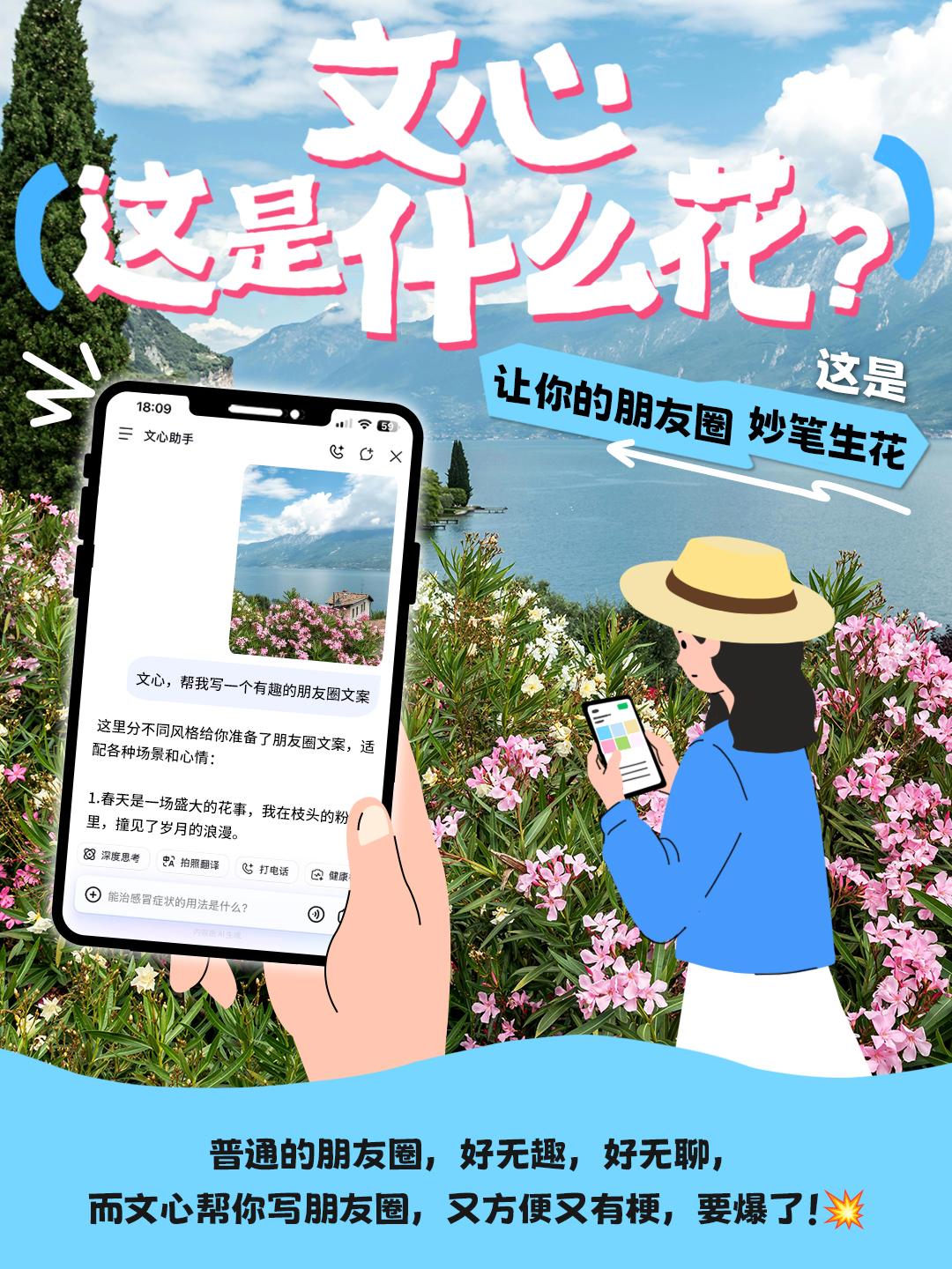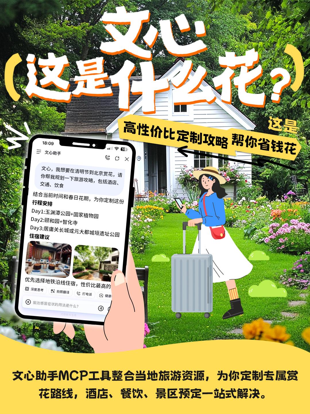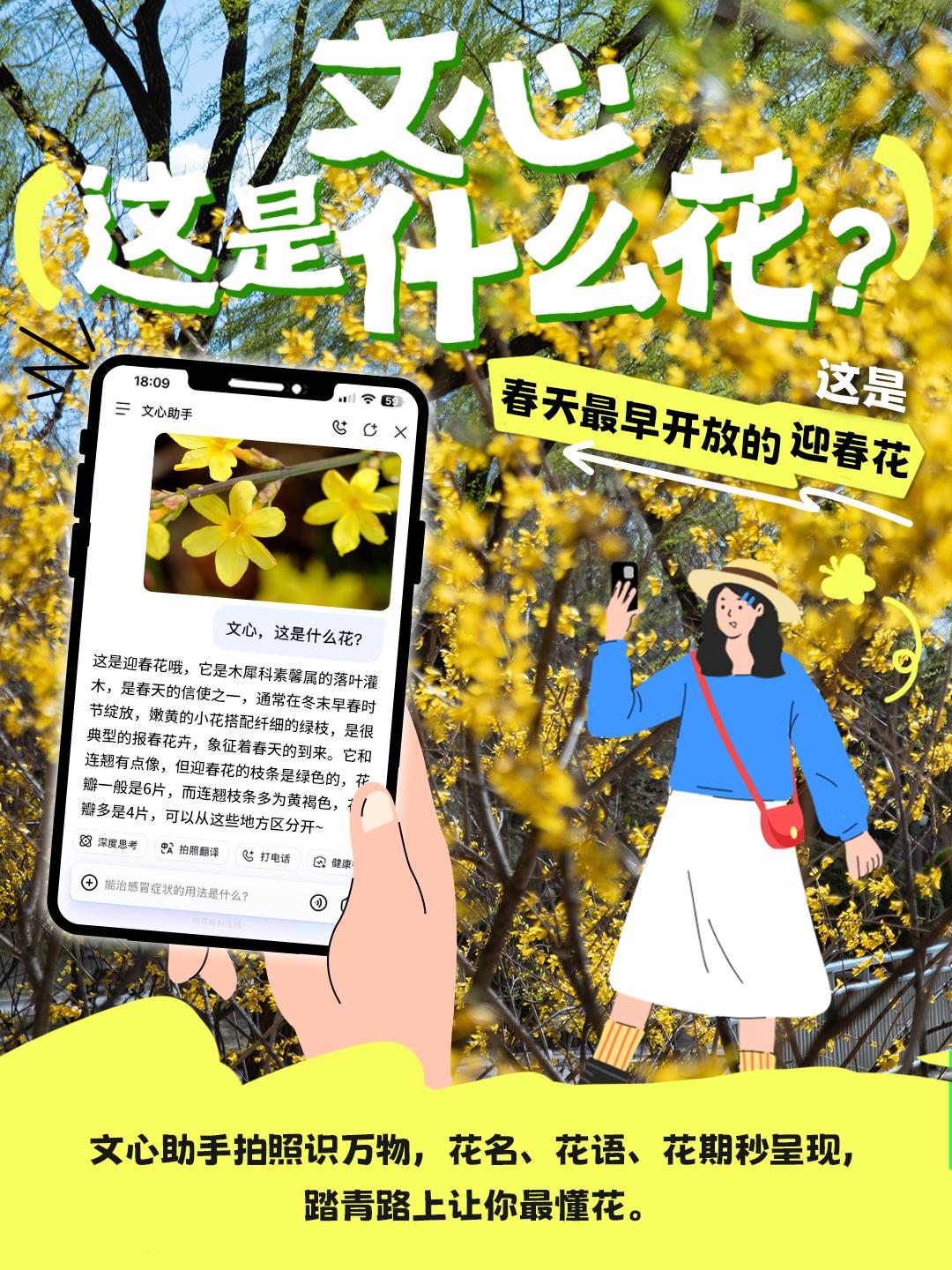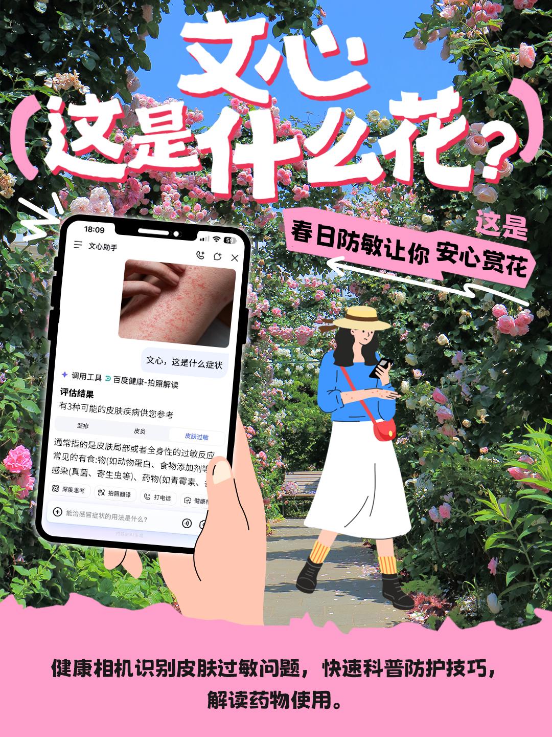 清明节想去踏青赏花? 你的全能春游搭子——文心助手已上线! 陪你解锁一整个春天的快乐。 🔍赏花识花,秒变行走植物百科; 🚘定制春游路线,酒店、美食、景点一站搞定; 💊春日过敏辩证查药,健康相机一拍全部安排; 📷AI相机直出氛围感大片,不再P图两小时; 📝发个赏花旅行帖,文案句句有梗爆款频出。 繁花与春光,皆不可辜负。 清明小长假放心玩,尽情晒! 这个春天, 文心助手和你一起“走花路” 清明 旅游攻略 春天的味道 文心