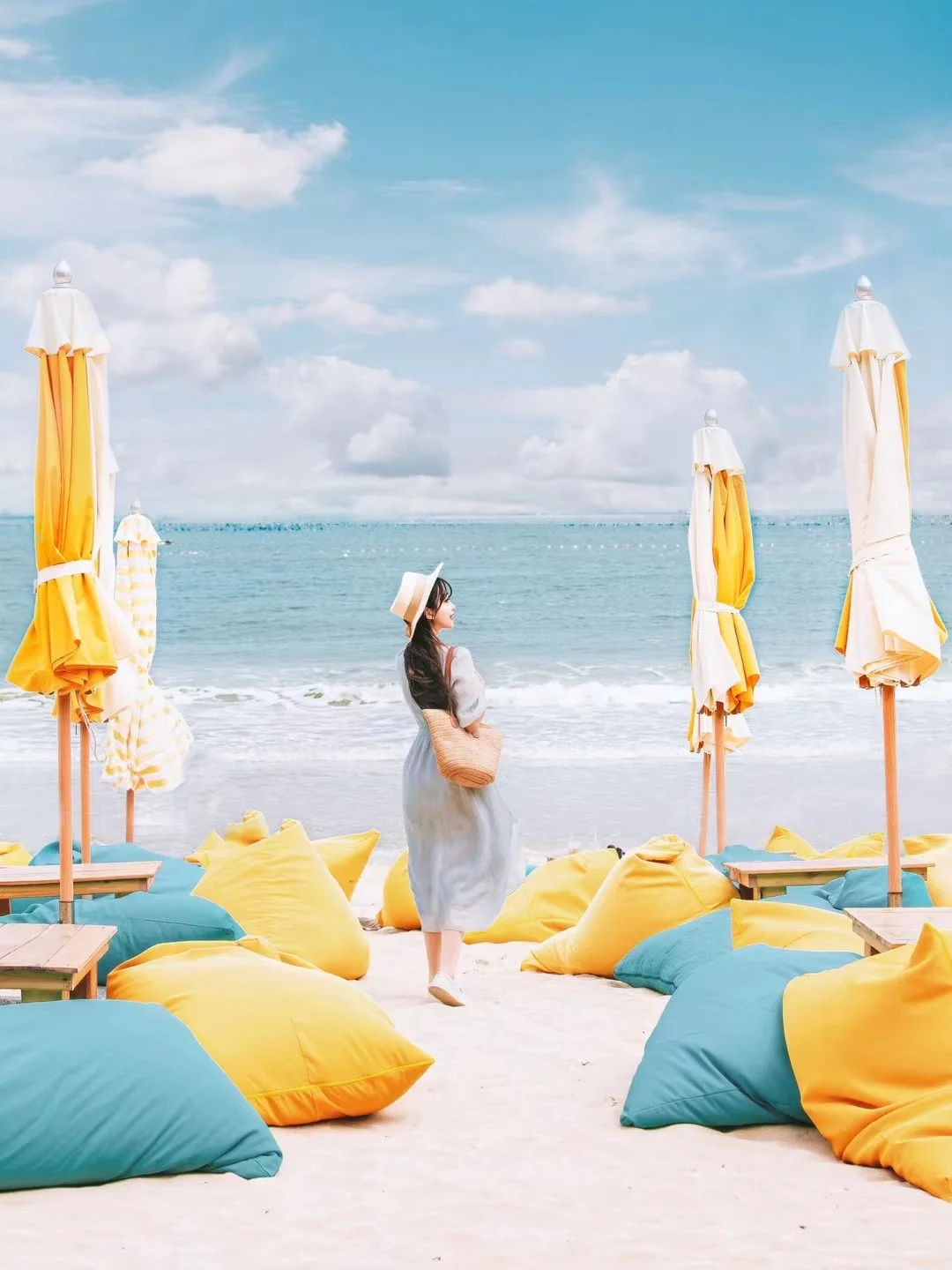 7️⃣坛南湾,一秒穿越马尔代夫度假,橙白相间的遮阳伞、色彩缤纷的懒人沙发,露天电影幕布以及一栋栋白色小木屋……这里有独一份的肆意慵懒