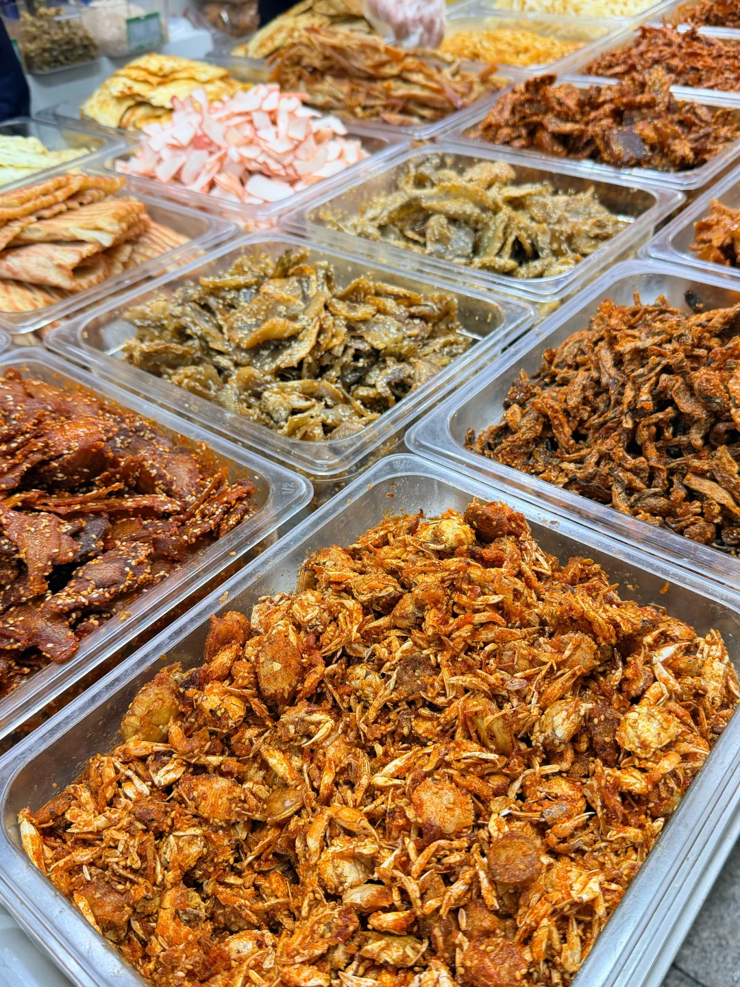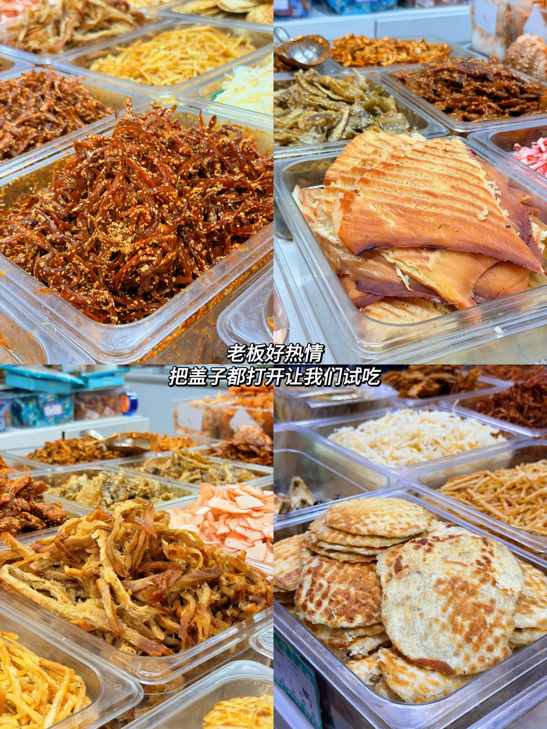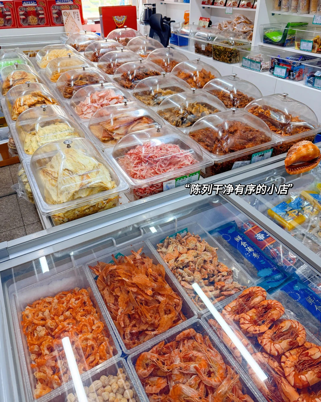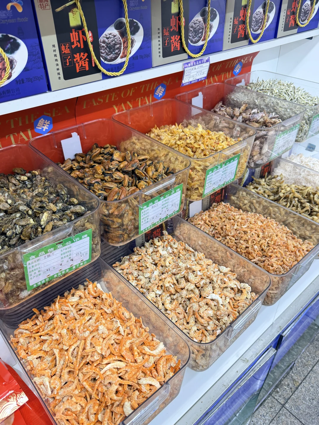 ⏩干品市场就是各种威海特产的聚集地了,各种小鱼干🐟、无花果干、虾干🦐品类敲多。干品市场内店铺很多,有的店陈列的很乱,有的店都没看到老板,后来逛到了一家陈列干净有序的店,刚进去老板就热情的让我随意试吃,小鱼干都是在食盒内陈列的,一眼就能看到品质很好很干净!老板还根据我的需求给我建议,买的数量也会根据我的需要去秤,完全不会特意多装,真的是良心商家了!