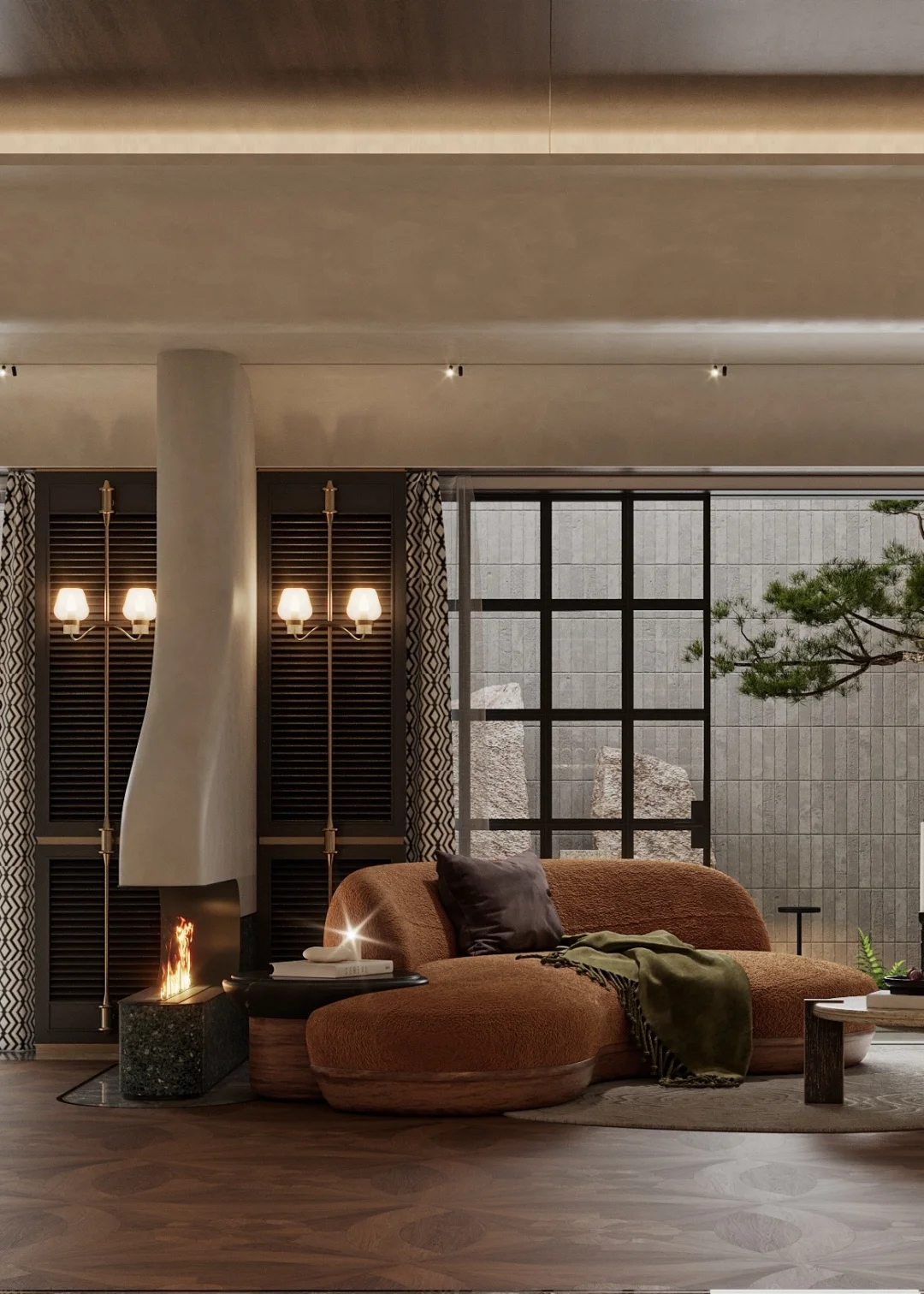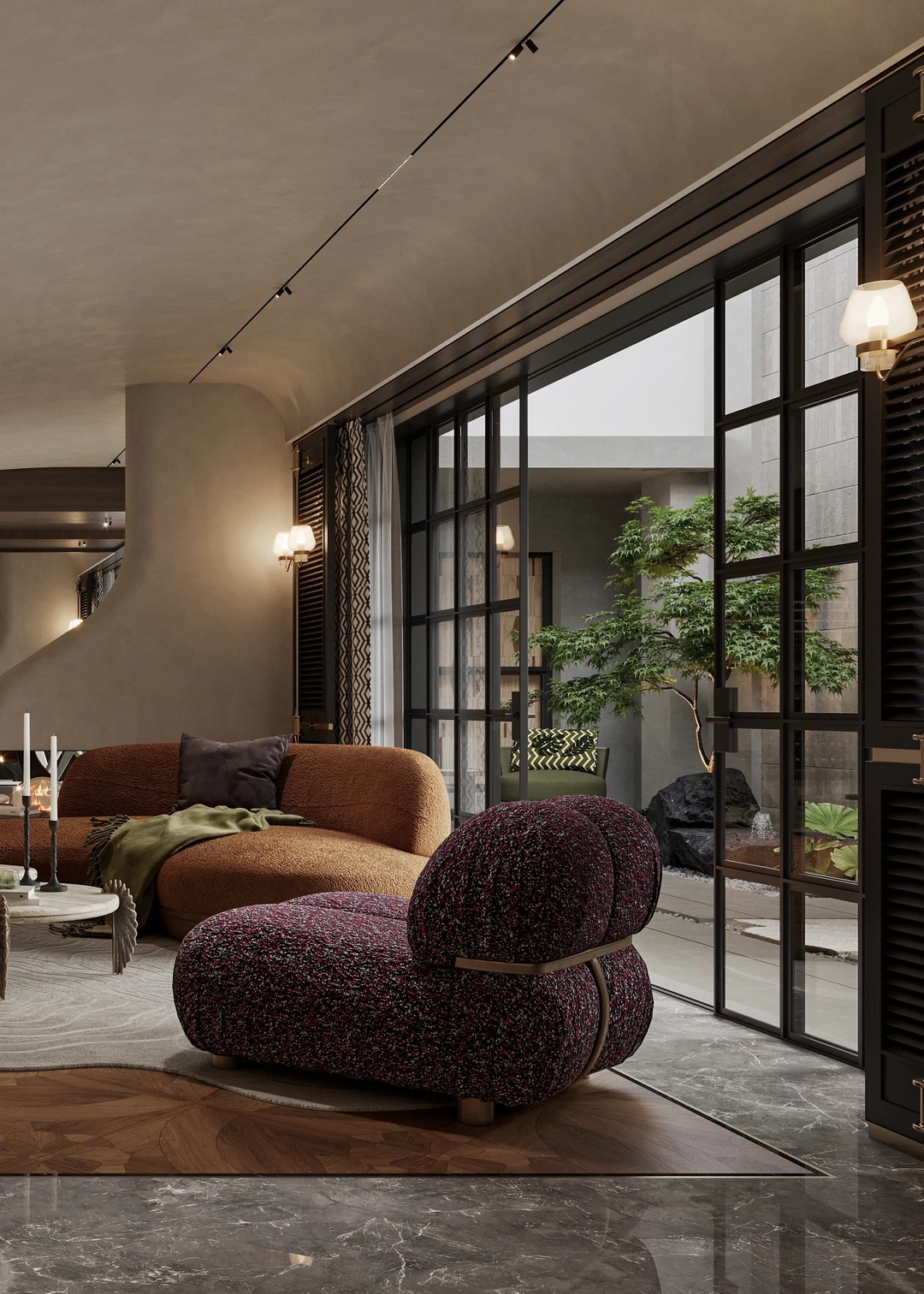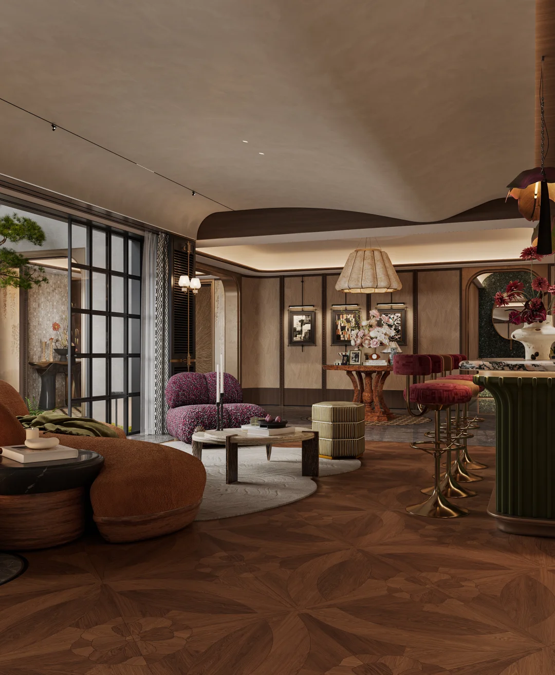 昆明900㎡端头别墅地下室设计把老钱风刻进细节里 一侧是格调拉满的腔调酒吧区,微醺自在; 一侧是温暖治愈的壁炉顾客区,围坐闲谈; 推门即是下沉花园,光影与绿意入室,私密又松弛。 不张扬的贵气,才是家该有的腔调。