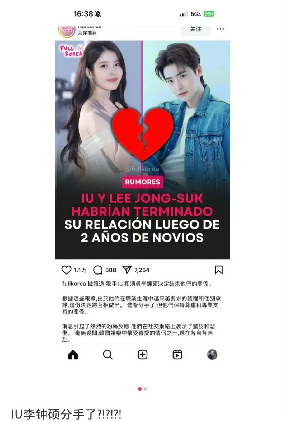 李钟硕 IU 分手了?曝IU李钟硕分手