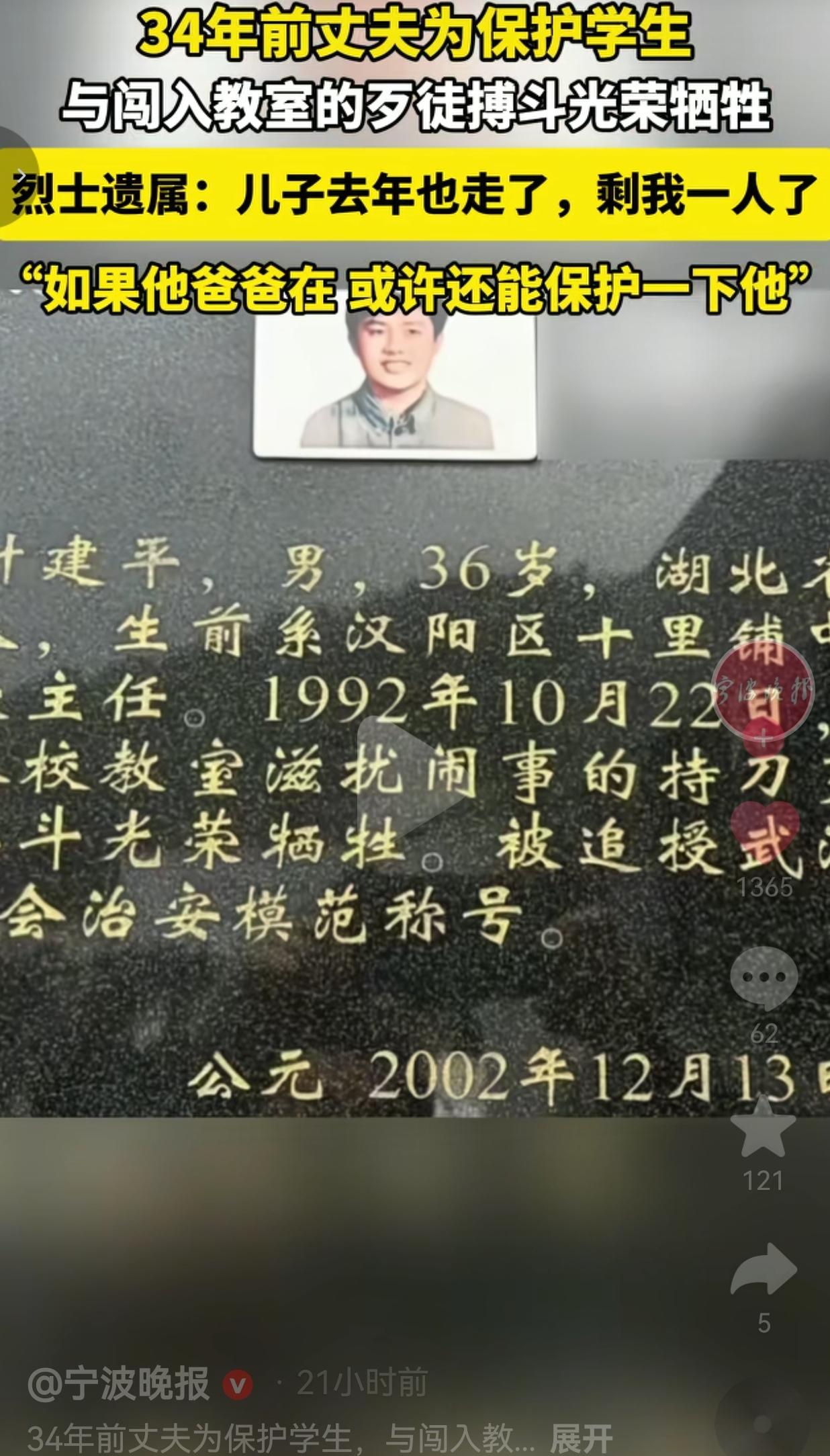 34年前用命护学生的英雄,如今妻儿只剩老母亲一人!那句“要是他爸在就好了”,直接破防了! 4月2日湖北武汉,一群学生来祭拜当年为保护他们牺牲的英雄叶建平,可当烈士的遗孀一开口,在场所有人的心都碎了! 叶建平,当年是武汉汉阳区十里铺中学的政教处主任。 1992年10月22日,一个歹徒持刀闯进教室闹事,为了护住一屋子学生,36岁的他冲上去跟歹徒殊死搏斗,最后壮烈牺牲,永远定格在了最年轻的年纪。 那时候,他的孩子还小,妻子还年轻,一家人的天,就这么塌了。 34年过去了,当年被他救下的学生们,从来没忘记过这份救命之恩,年年都来祭拜他。 可今年,当大家再见到叶建平的妻子时,老人的一句话,直接让所有人破防:“我的孩子去年也走了,就剩我一个人了……要是他爸爸在,或许还能保护一下他……” 就这么一句话,我隔着屏幕都能感受到老人的绝望和心酸! 当年丈夫为了一群素不相关的学生,把命都搭进去了,她一个人拉扯孩子长大,熬了34年,好不容易把孩子拉扯到40岁,结果白发人送黑发人,最后就剩她一个孤老太太了! 她守着烈士的名分,守了一辈子,最后却连自己的孩子都留不住。她那句“要是他爸在就好了”,哪里是抱怨,是一个母亲失去孩子后,最无力、最崩溃的念想啊! 当年叶建平用命护住了别人的孩子,可他自己的孩子,却没能等到父亲的保护,早早走了,留下老母亲一个人在世上,孤零零地活着。   网友评论区直接炸了,每一条都戳心! 有的网友说:看完直接泪崩!英雄用命护了别人的孩子,自己的孩子却没了,老母亲孤苦伶仃,这是什么人间疾苦啊! 也有的网友说:十里铺中学的学生,一辈子都欠叶老师的!34年了还能记得来祭拜,这点真的没话说,但老人太苦了! 还有的网友说:最破防的就是那句“要是他爸在就好了”,当妈的失去孩子,天塌了都没这么痛!英雄的家人,凭什么要受这种苦? 也有的网友说:看哭了!英雄不该被遗忘,英雄的家人更不该被辜负!求求相关部门多照顾照顾这位老人,别让英雄流血又流泪! 说实话,我真的埋怨命运对他们一家人不公!凭什么?凭什么英雄用命换了别人的平安,自己的家人却要承受这么大的苦难? 叶建平当年完全可以躲,可以退,可他没有!他是老师,是父亲,是丈夫,可他更是一个顶天立地的英雄!他冲上去的那一刻,就没想过自己的死活,他只想护住教室里的孩子! 可他护了别人一辈子,谁来护他的家人? 34年了,老母亲一个人拉扯孩子,好不容易熬到孩子长大,结果孩子也走了,就剩她一个人。她守着丈夫的烈士碑,守着一辈子的思念,最后连个送终的人都没有! 我真的不敢想,这些年她是怎么过来的。丈夫走的时候,她才三十多岁,一个女人,带着孩子,顶着烈士家属的名头,一步一步熬到白发苍苍,结果最后还是孤孤单单一个人。 那些被叶建平救下的学生,现在都已经当爷爷当奶奶了,他们年年都来祭拜,这份感恩值得点赞,但我更希望,能有更多人站出来,好好照顾这位老人! 英雄为我们挡了刀,我们绝不能让英雄的家人寒心! 什么是英雄? 英雄就是明明自己也有老婆孩子,明明自己也怕死,可在危险来临时,还是会毫不犹豫地冲上去,用自己的命,换别人的生。 叶建平就是这样的英雄!他用36岁的生命,换了一屋子学生的未来,可他的未来,却永远停在了1992年的那个秋天。 他的妻子,用一辈子的孤独,换了他的名留青史;他的孩子,用40岁的生命,让这份遗憾更添了一份心酸。 我们永远不能忘记,今天的岁月静好,是无数像叶建平这样的英雄,用命换来的!我们更不能忘记,英雄的身后,还有需要我们守护的家人! 英雄从未远去,精神永远不朽!愿所有见义勇为的英烈安息长眠,愿英雄的家人,被这个世界温柔以待!