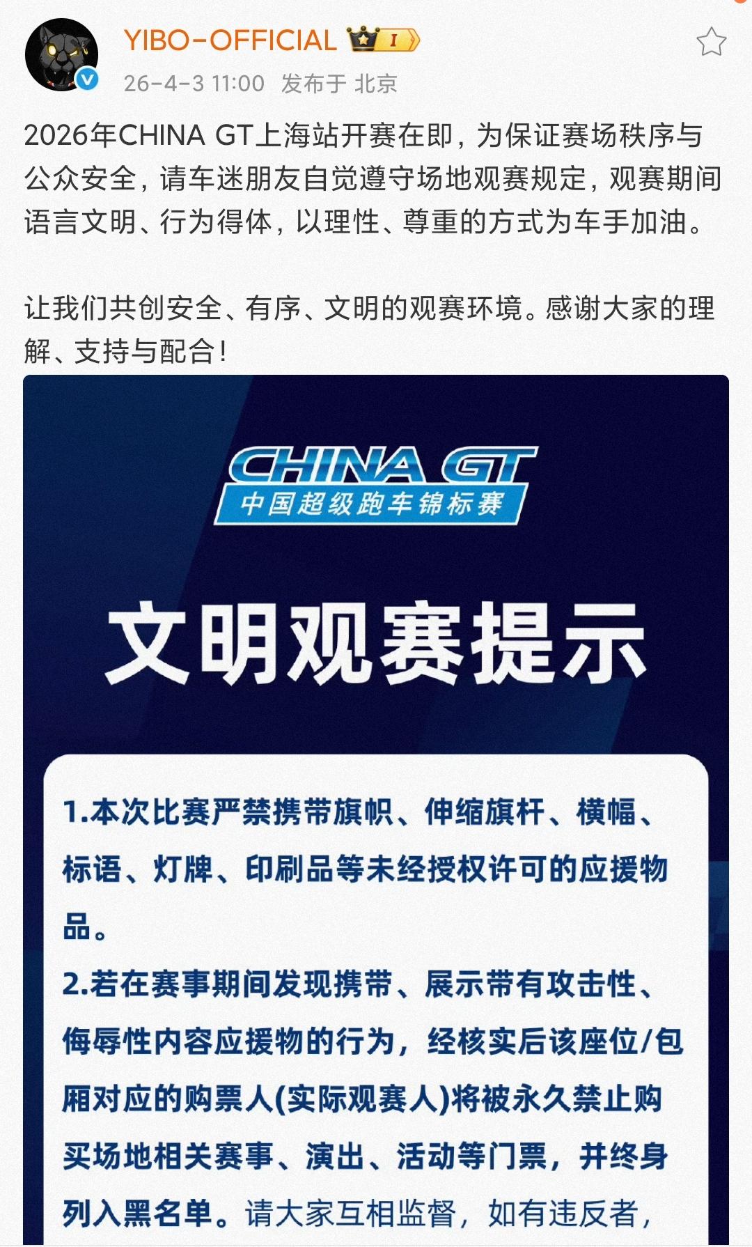 王一博宣发博与CHINA GT均郑重发布关于上海站文明观赛提示,从上次、上上次