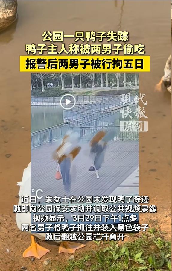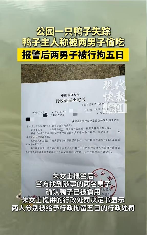 这下摊事了!广东中山,两名男子看公园里面的鸭子长得不错,就趁着没人将其套走回家吃掉,不料,这是一名女子寄养在公园的,报警后,警方很快就找到两人,他们还为此被行政拘留五日 朱女士称,这只鸭子是她几个月前在套圈摊上看到的,当时小黄鸭脚上有伤,她花钱买下来,带回家养 养到五六斤重,鸭子凌晨老叫,邻居有意见,她才送到金钟湖公园。公园本来就有观赏鸭和鹅,管理方也同意接收。她时不时还去看,鸭子活得挺好,结果没几天,没了 朱女士发现鸭子没了,报警。警察动作也快,很快就找到这两个人。最后,每人行政拘留五天 有网友认为处罚有些过重 可换个角度想:如果每个人看到公园里养得好的动物,觉得不错就顺手牵羊,那公园成什么了?自助餐厅吗? 两个当事人可能真没觉得自己犯了多大事。一只鸭子,市场上买也就百来块钱,至于拘留吗?他们没想明白的是,问题的关键不在鸭子的市场价,而在那只鸭子不是无主之物。它有主人,有来历,被安顿在公园里好好活着。你把它套走吃了,跟从别人家院子里抓只鸡炖了,性质上没有任何区别 有人可能会说,那朱女士把鸭子放公园里,也没挂牌子没写名字,别人怎么知道是有主的? 道理很简单,公园里的动物,不管天鹅、鸳鸯还是鸭子,只要不是野生的,就不是无主物。你分不清是野生还是家养的,正确的做法是不动。不是看着好就拿。这个逻辑放在任何公共场合都成立 说到底,这两个人栽在一只鸭子上,不冤。他们不是饿极了没饭吃,也不是不知道这只鸭子可能有主人。就是觉得不值钱,拿走了也没人较真。结果偏偏有人较真了