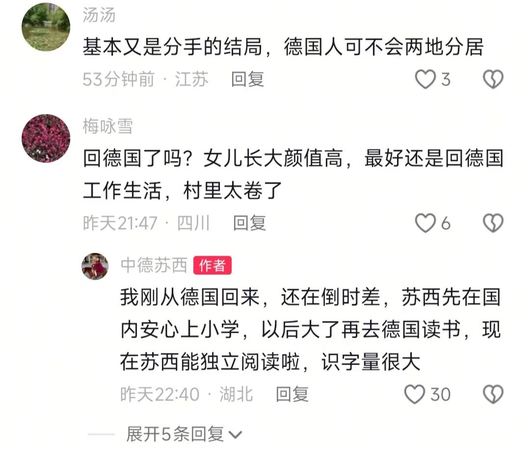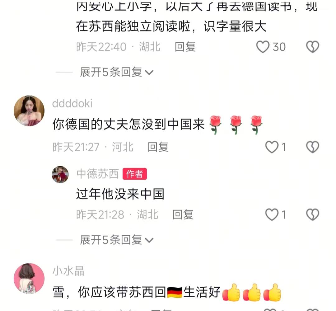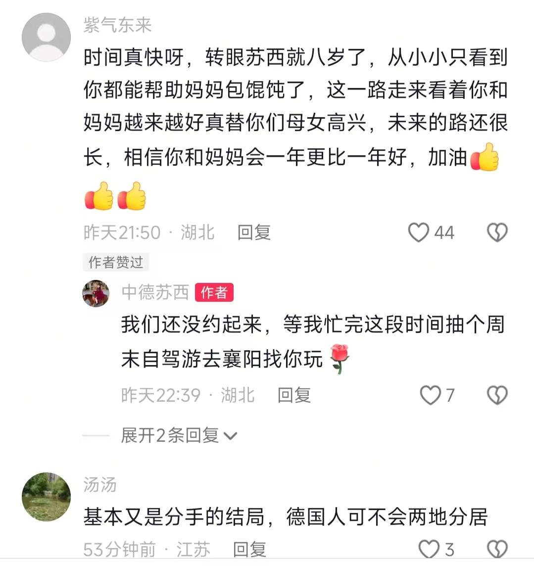 现在全网最闹心的女人,就是网红中德苏西的小雪了吧! 不是因为单亲带娃日子难,也不是因为跨国婚姻遇波折, 而是因为自己离没离婚,要被全网网友追着扒着问,连停更几天都能被传婚姻破裂,真服了 说实话,我刷到中德苏西小雪的最新回应,整个人都郁闷坏了,本来想直接划走,结果越想越闹挺。我晕,一个单亲妈妈带着娃跨国折腾这么多年,日子刚顺一点,怎么连人家离没离婚,都要被网友追着扒着问啊?真的看得我都绷不住了。 老实讲,小雪这一路走的,真的太让人憋屈了。湖北姑娘,家里有哥有爸妈,本来好好的去德国生活,结果遇着苏西的生父,眼瞅着要生了,人家直接拍拍屁股跑路了。换谁不得崩溃啊?可她愣是一个人带着娃在德国扛下来了,中间谈了个带娃的意大利男友,本来以为能有个依靠,结果还是没走到最后。 说真的,我之前刷到她的旧视频,有个评论我记到现在。有个同样单亲带娃的姐妹留言,说自己在国内有爹妈帮忙,带娃都快熬秃了,她一个人在异国他乡硬扛,换自己早芭比Q了。那时候满屏评论都在劝她,回湖北吧,有家有房有亲人,总比一个人在外面飘着强。 然后她真的听劝了,麻溜的带着娃回了湖北老家,跟爸妈一起住。说实话,那时候她的视频,肉眼可见的松弛下来了,娃有人帮着带,饭有人帮着做,她只需要专心搞工作,日子过得巴适得板,网友都替她开心,说这姑娘可算熬出头了。 本来大家都以为她就这么安稳过日子了,本来想她吃了这么多异国感情的苦,肯定不会再碰跨国恋了,但后来发现,人家还是跟着自己的心走了,又遇着了德国的安迪,俩人直接定了结婚计划。男方在德国求了婚,她一口就答应了,还在湖北办了婚礼。那时候评论区直接炸了,好多人刷“不是吧?刚安稳下来又折腾?”,但人家就认准了自己的选择。 结果这阵子,她带着娃回了湖北,长时间不更新视频,老公安迪也压根没露过面,网友的猜测直接稀了咣当的满天飞,满屏都在问是不是离婚了,说实话我隔着屏幕都觉得膈应。 然后她终于更新了视频,带着苏西在生日当天包馄饨,画面暖乎乎的,说自己刚从德国回来,娘俩一切都好。被网友追着问是不是离婚了,她直说还没离,真离了会公开告诉大家。之前听别人说,人生修行就三件事:接受无常,放下执念,管好自己的嘴。这话放这事儿上,真的太戳人了。 总之,我想说的是,人家的日子人家自己过,咱们真的别瞎操心了。她一个单亲妈妈,能把娃带好,能把自己的日子过明白,就已经够给力了。与其追着问人家离没离婚,不如多顾顾自己的生活,你说对不?