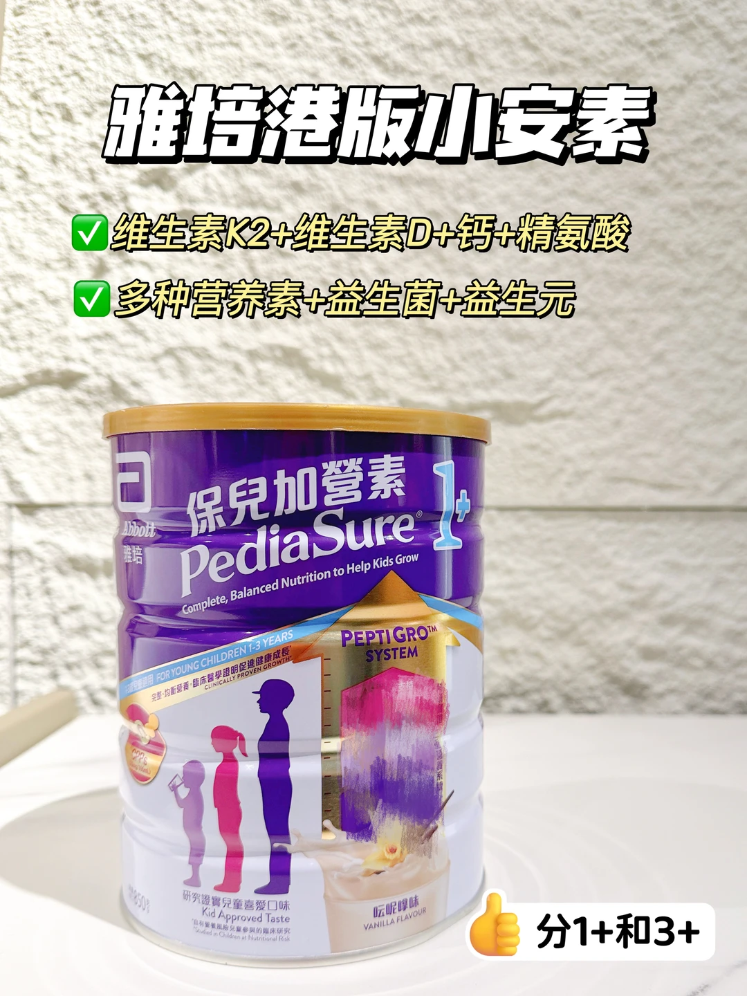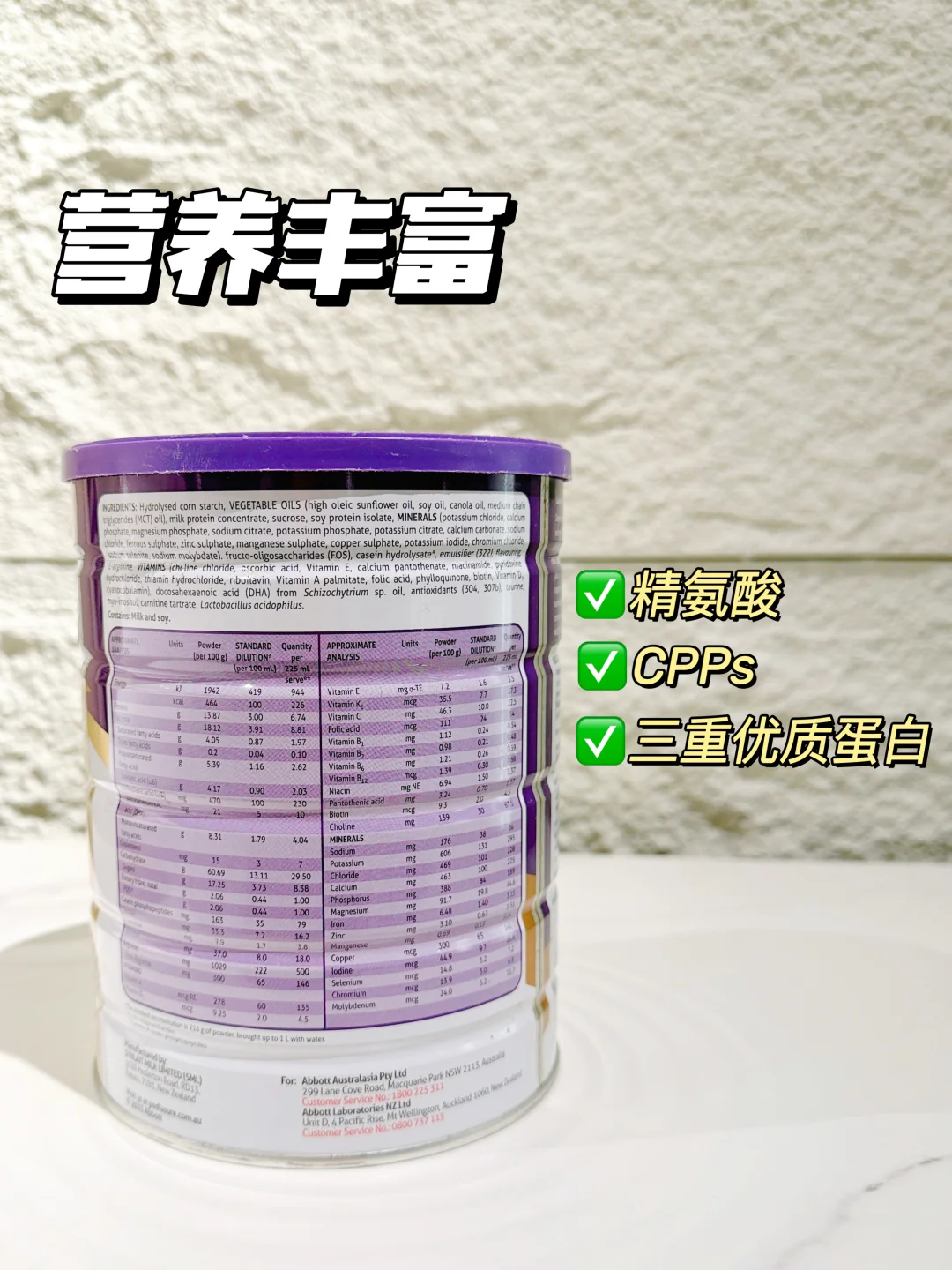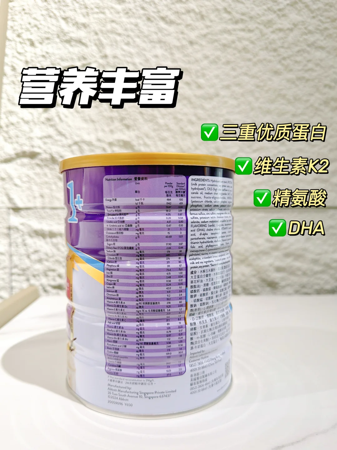 配方亮点:沿用雅培全球经典营养配方,除精氨酸 + CPPs 外,特别添加天然维生素 K2