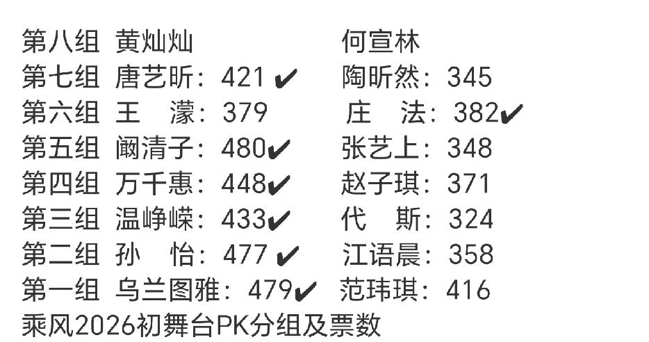 看了一晚上,到最后才知道被浪姐7节目组耍了[捂脸]!那有什么淘汰,全部晋级! 原以为本来浪姐玩的就是一个心跳,宣发每日都有淘汰,包括初舞台,可结果呢,卯着劲儿看了一整晚,最后全部晋级了,还美其名曰经过老师和观众的一致通过后决定的! 看来今年浪姐的赛制只有一个选择,随心所欲! 先看看首场初舞台一共8组,这个评分真是绝了! 阚清子以一首泣不成声的《爱的代价》获得了本场最高分,理由是浪姐不是体育赛事,可以打感情分[捂脸]!这一时间段也被小齐宣布创下了浪姐有史以来的收视率新高! 看到这里不免为往届的浪姐惋惜啊,姐姐们你们来早了啊[笑哭]! 今晚最意外的是王濛,没想到她竟然还是一位Rap担当,说唱相当不错,可惜她今晚就要遇到了来自越南的浪姐冠军庄法,路人都能看明白人家是专业的,王濛唱的再好也是业余的! 庄法短短一分多钟的表演,有钢琴,有唱跳,有钢管舞,还有倒立飙高音,某种程度上来说,今年的浪姐至少今晚浪姐水平照着庄法都差了一大截,庄法是来比赛的,其他姐姐是来玩的[大笑]! 浪姐2026 浪姐7名单 浪姐7阵容 王濛