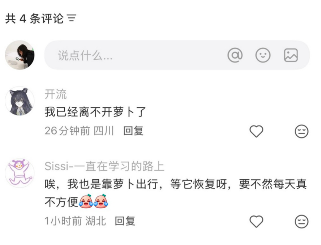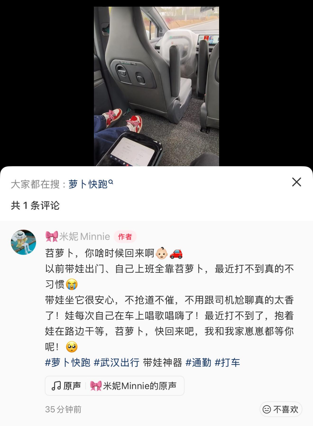 翻了翻网友的评论,笑不活了,有通勤党吐槽“以前下班打开 APP,萝卜就在楼下等我,现在我都走到家了,还没刷到附近的车”;还有铁杆粉丝表示,“我已经离不开萝卜了”。
