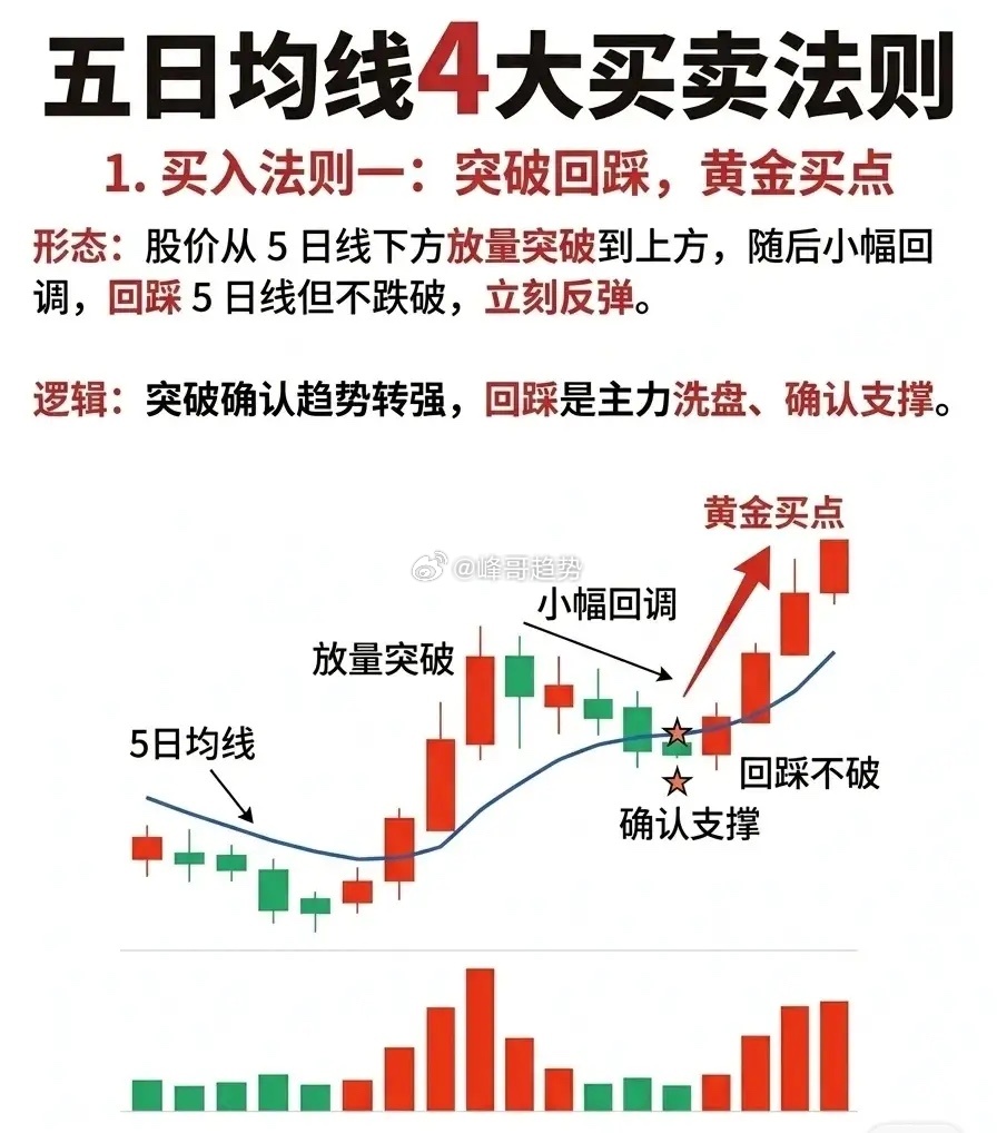 - 5日均线拐头向上 → 趋势转折点- 股价从下方站上 → 多头入场确认- 买点确认 → 可分批建仓,等待主升浪