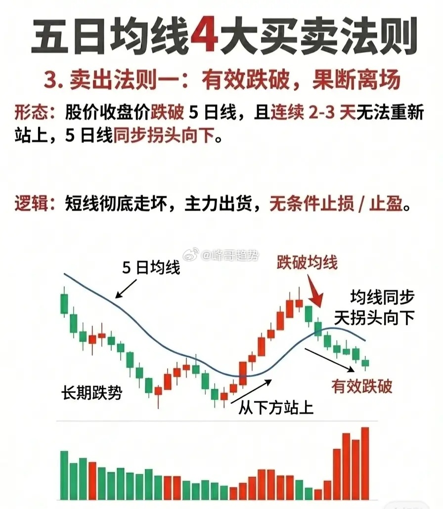 - 跌破均线 → 趋势破位- 连续2–3日不站上 → 有效性确认- 均线同步拐头向下 → 空头主导,离场信号- 有效跌破 → 严格执行纪律,不侥幸