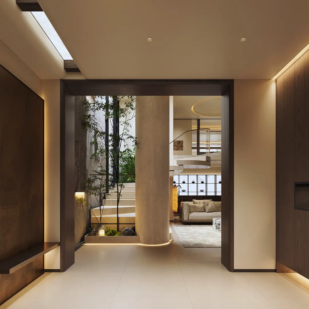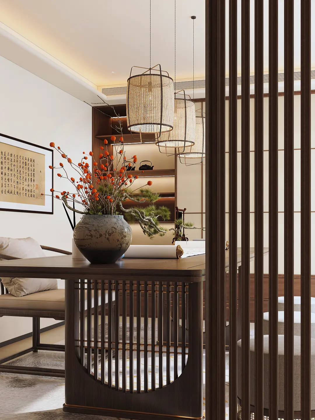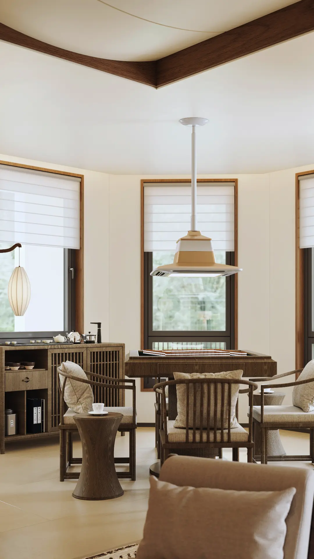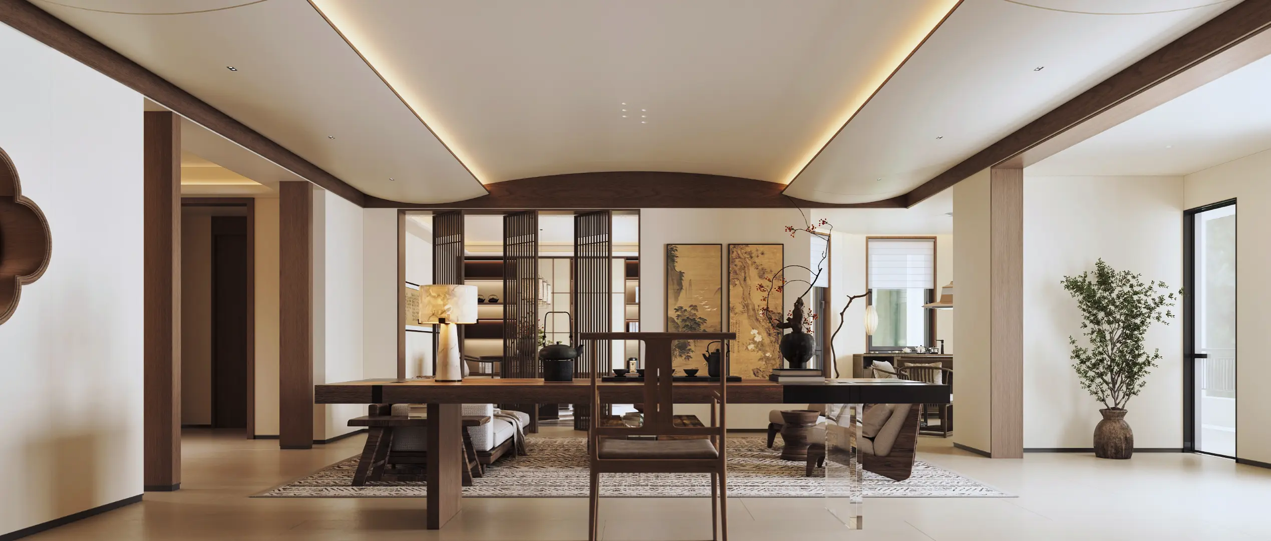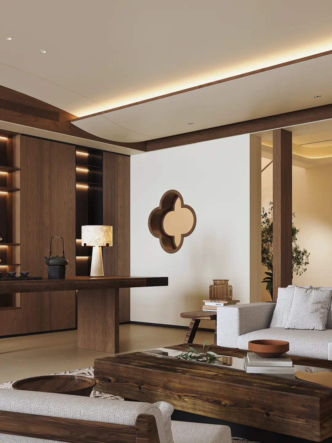 没有乍见的惊艳,只有久处的安然。微水泥的墙面保留了手工的痕迹,原木的纹理诉说着生长的年轮,纸与麻的肌理在光影里呼吸。东方不是符号,是留白的智慧——一个石钵,一枝枯木,半幅素帘,便有了四季的来去。风穿过庭院的竹,水声在石槽里低语。这里不急着填满什么。你坐下来,茶慢慢热,光慢慢移,心慢慢静。