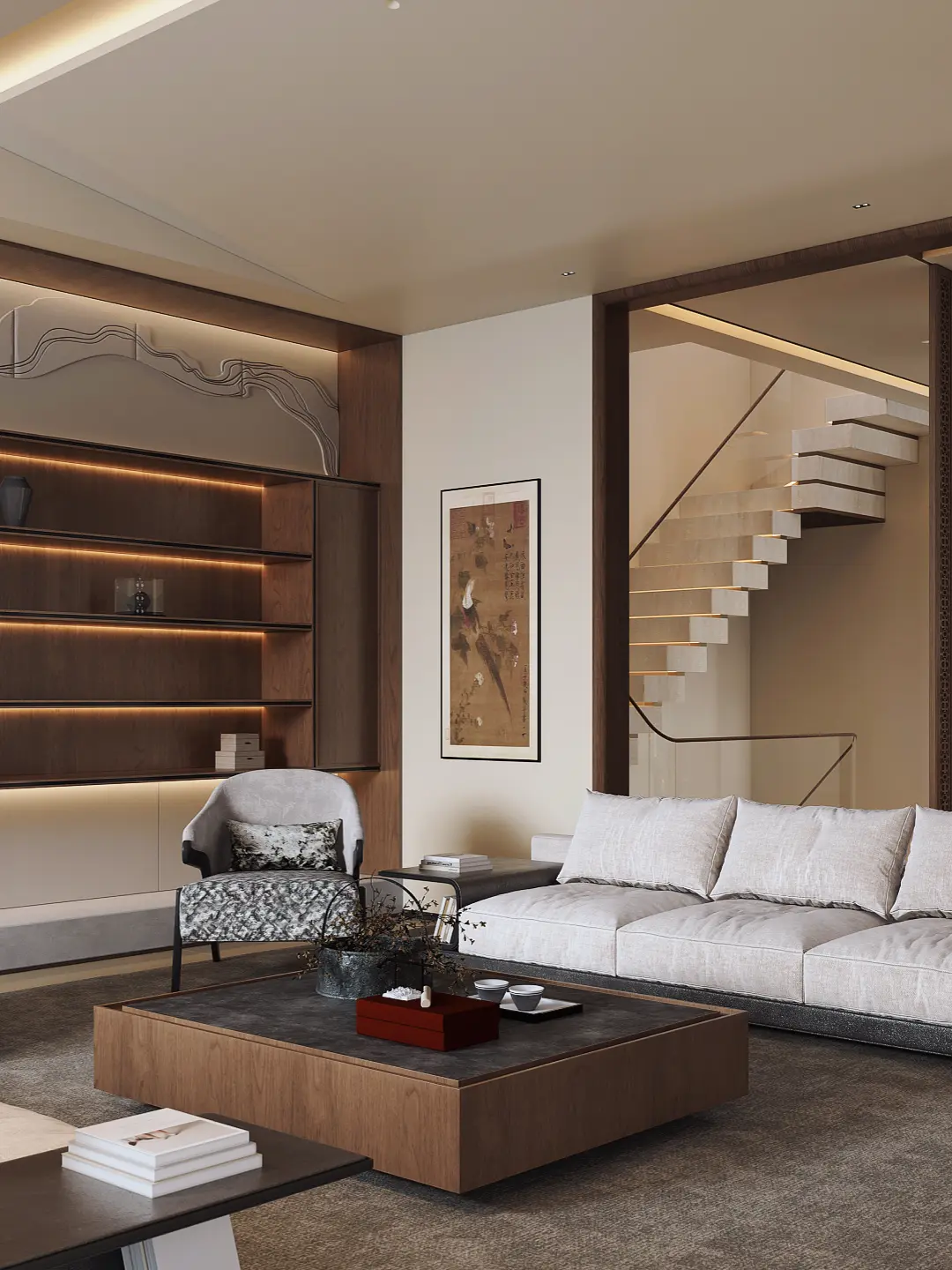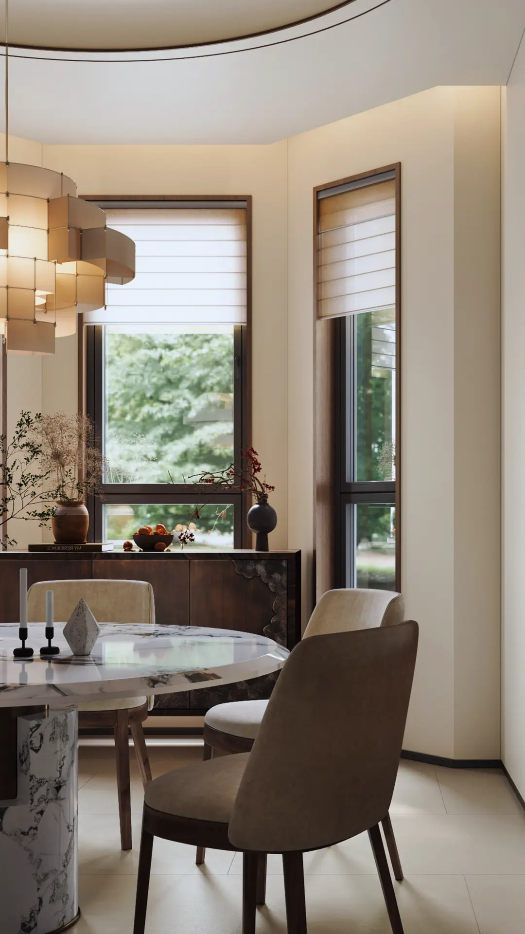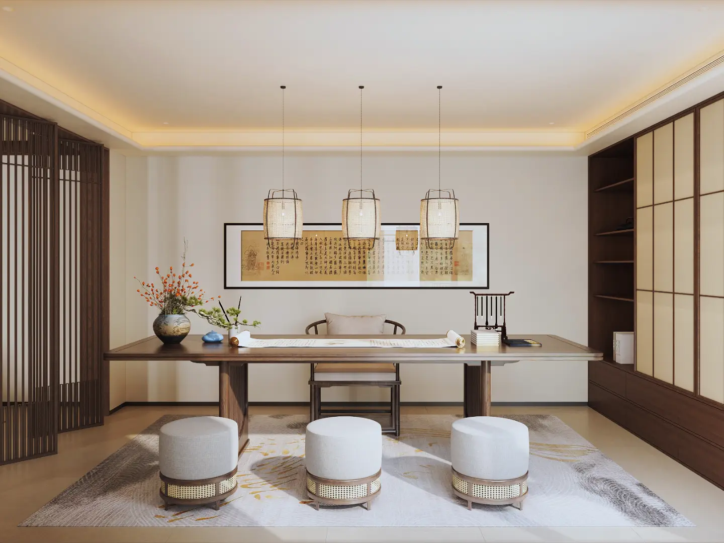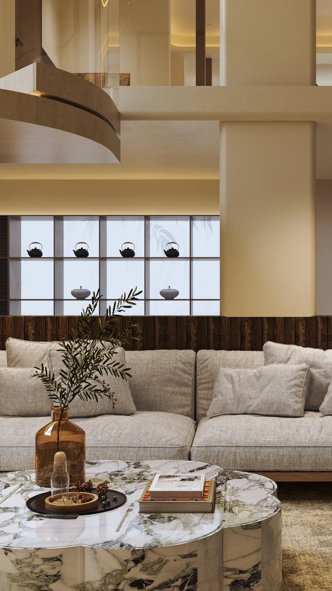 没有乍见的惊艳,只有久处的安然。微水泥的墙面保留了手工的痕迹,原木的纹理诉说着生长的年轮,纸与麻的肌理在光影里呼吸。东方不是符号,是留白的智慧——一个石钵,一枝枯木,半幅素帘,便有了四季的来去。风穿过庭院的竹,水声在石槽里低语。这里不急着填满什么。你坐下来,茶慢慢热,光慢慢移,心慢慢静。