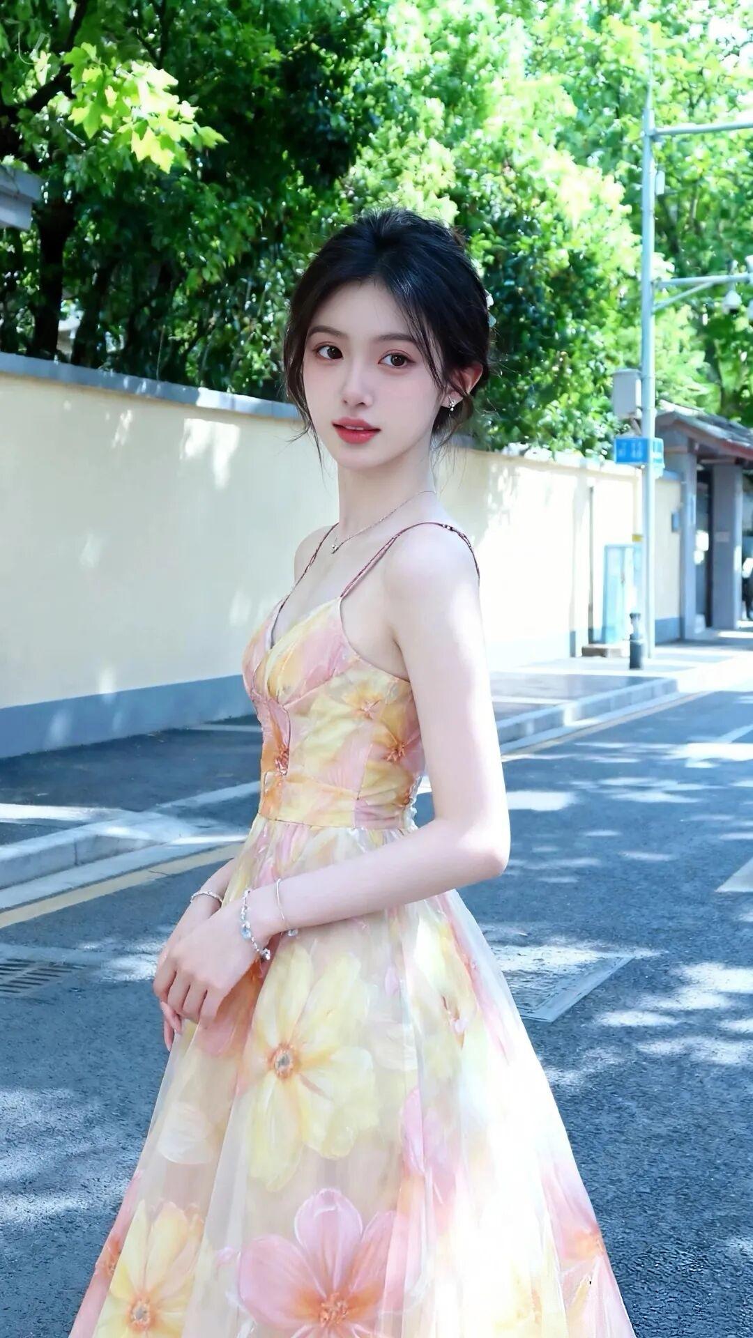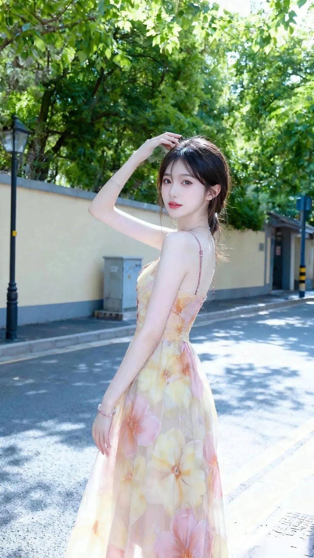 整体呈现清新、明媚、灵动的春日氛围,暖黄与柔粉交织的花色长裙搭配绿意背景,尽显少女感与浪漫气息。