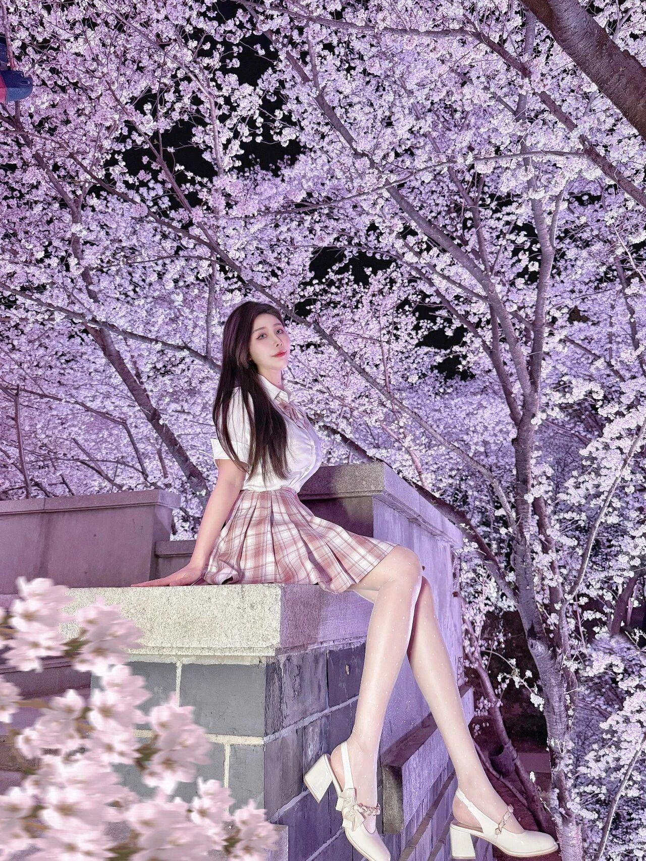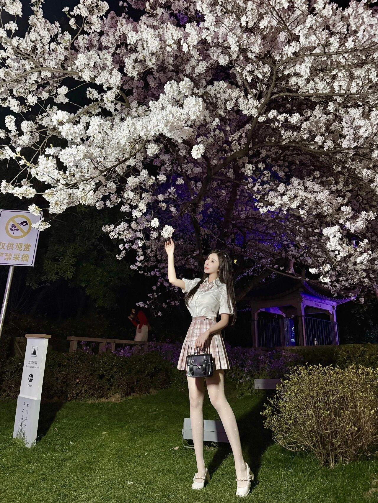 夜色中的樱花林如梦似幻,满树繁花在灯光映照下呈现出梦幻的粉紫色调,营造出唯美浪漫的氛围。少女置身其中,与漫天樱花相映成趣,构成一幅清新治愈的春日夜景图。