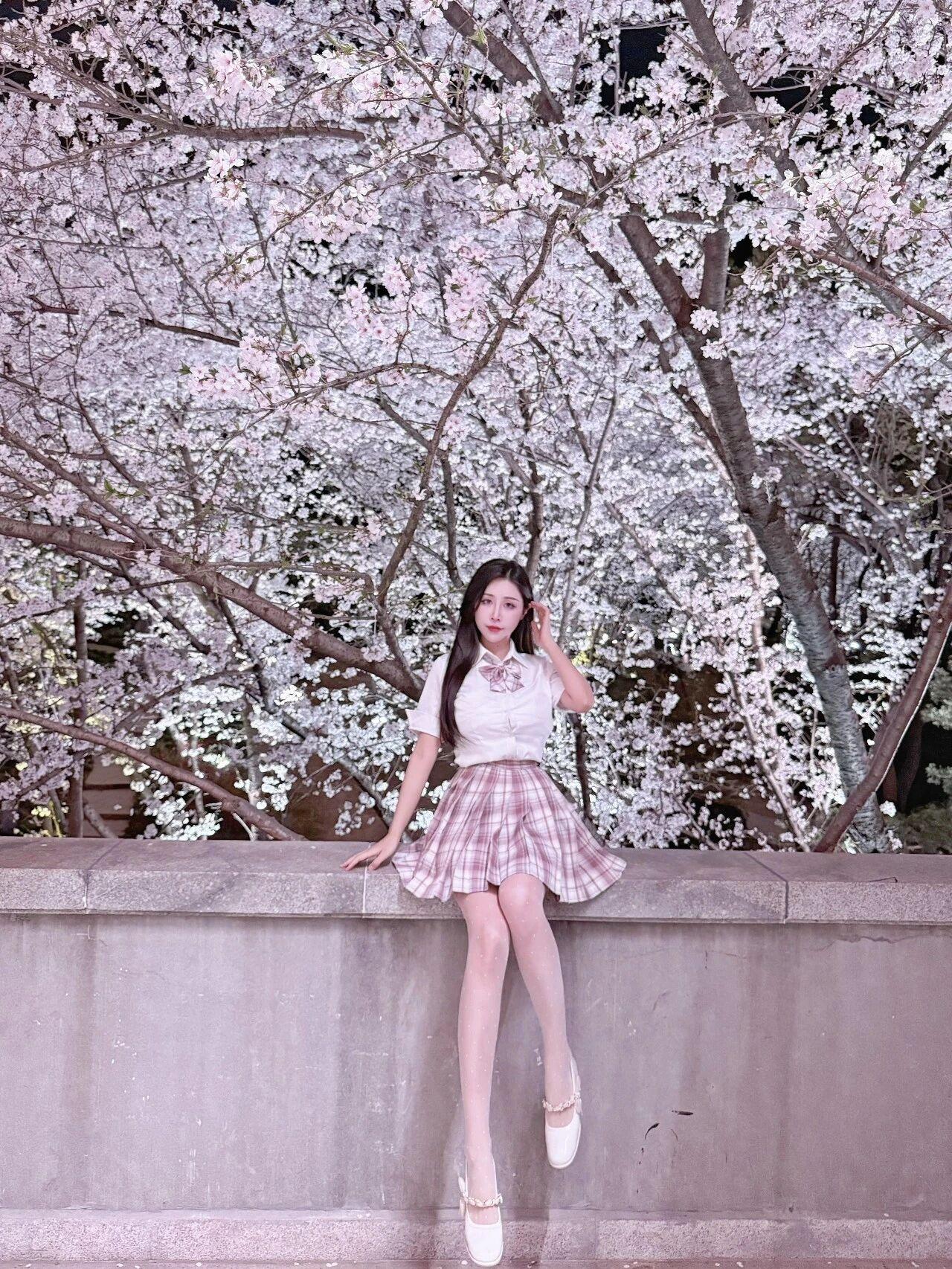 背景是繁茂的樱花树,花瓣层层叠叠,在夜色中绽放出温柔的光彩,地面绿草如茵,搭配古朴的石质栏杆与台阶,增添了几分雅致。灯光柔和地洒在画面中,将樱花的柔美与少女的清新完美融合,整体氛围浪漫又治愈,满是春日的美好与灵动。