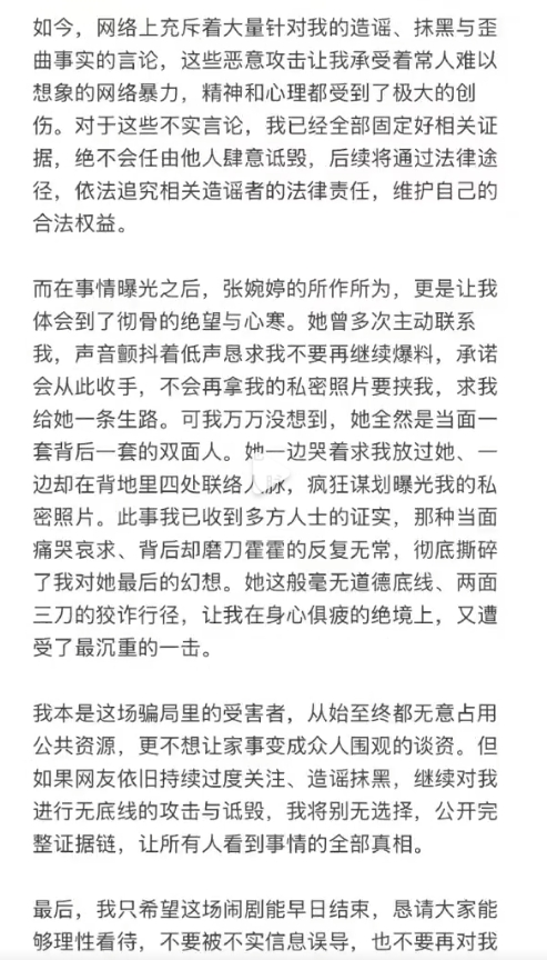 更离谱的是,张婉婷一边私下联系求放过,承诺不曝光照片,一边又四处找人想曝光她的私密照,当面一套背后一套。