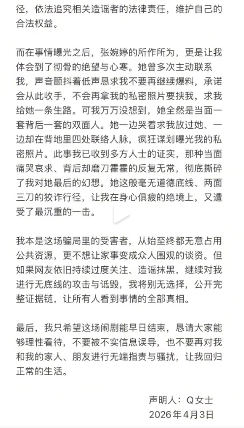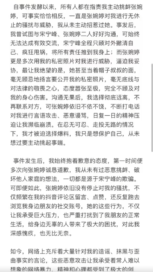 自己从未主动招惹张婉婷,事情曝光后宋宁峰直接把所有责任推给她,张婉婷更是拿私密照片反复威胁。她虽多次向张婉婷道歉,表明自己也是被骗受害者,却仍遭到张婉婷骚扰账号、攻击朋友。