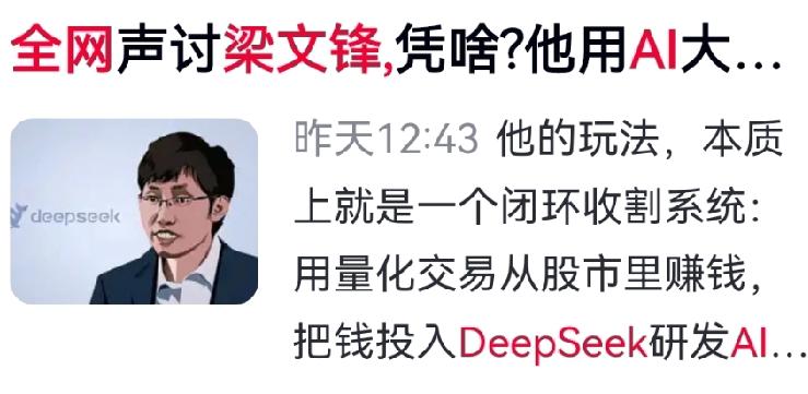看懂DeepSeek,才懂梁文锋的降维屠杀有多狠 全网都在吹DeepSeek的AI实力,可绝大多数人都没看透,它最核心的本质是交易基因。梁文锋从没想过跟硅谷巨头盲目内卷通用AI,而是手握世界级大模型,直接扎进量化交易赛场,上演了一场教科书级别的降维打击。 作为国内最早把机器学习用在量化领域的人,他深耕十几年,从实现AI自主交易,到建成亚洲顶级私有AI算力池,一步步搭建起“交易盈利养AI,AI赋能赚收益”的完美闭环。 当其他AI公司还在靠融资续命、打磨聊天创作功能时,DeepSeek早已在残酷的金融市场摸爬滚打,一天能挖数千交易因子,实力完胜人类顶尖交易员。没有半点虚浮概念,全是实打实的收益与硬核实力,这才是AI落地的终极形态。 对此,大家怎么看? AI降维打击 金融科技天花板 量化投资 DeepSeek硬核实力