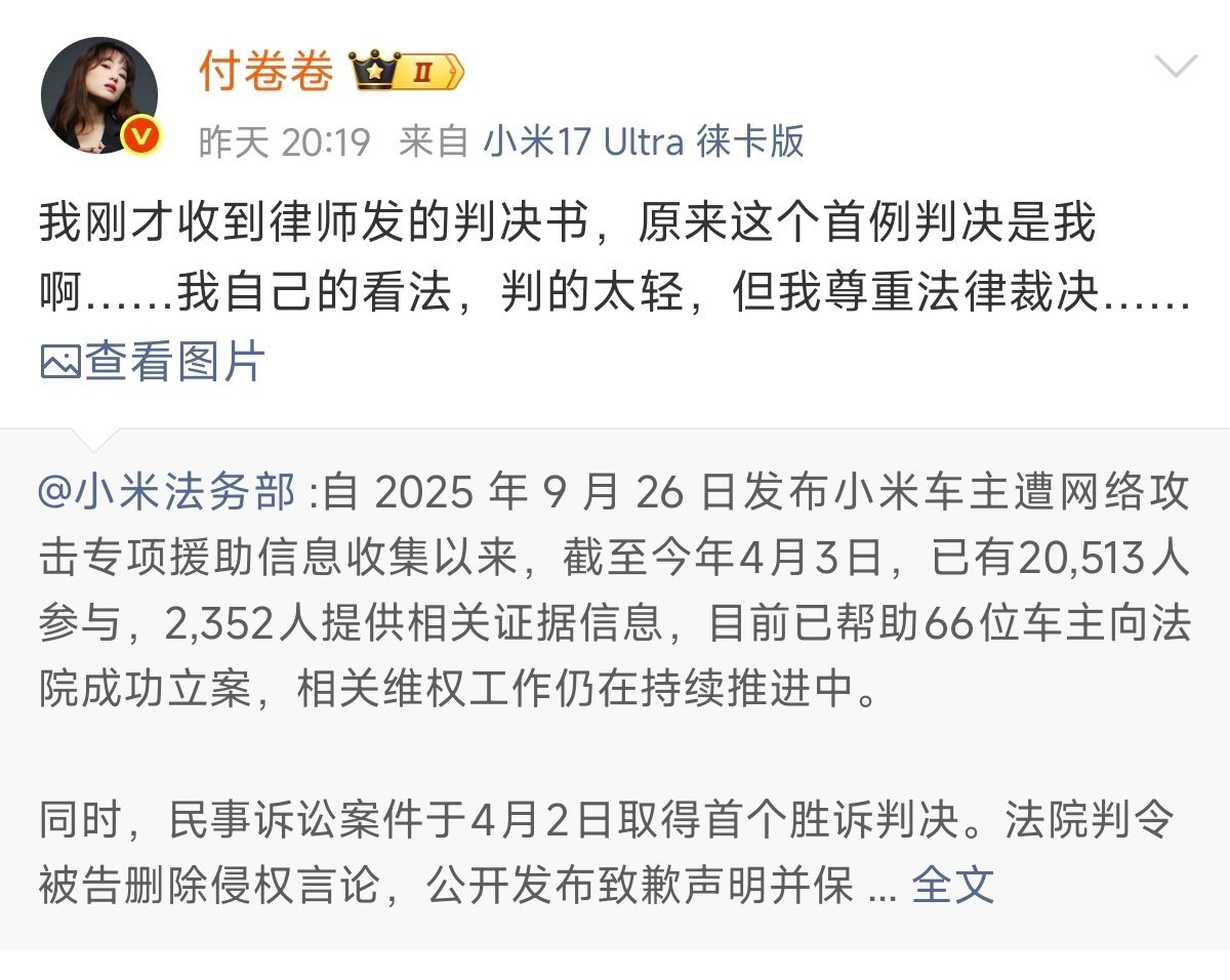 山东好汉 23 2026-04-04 12:42 小米法务部胜诉率很高,特别是面对客户维权投诉,他们有的是招 义务扫盲 回复 04-04 15:45 你真有种就去小米车主那里骂呀,划车你这种人估计也是没钱赔 非专业人士来啦 回复 04-04 16:39 小米法务真的不行 ……