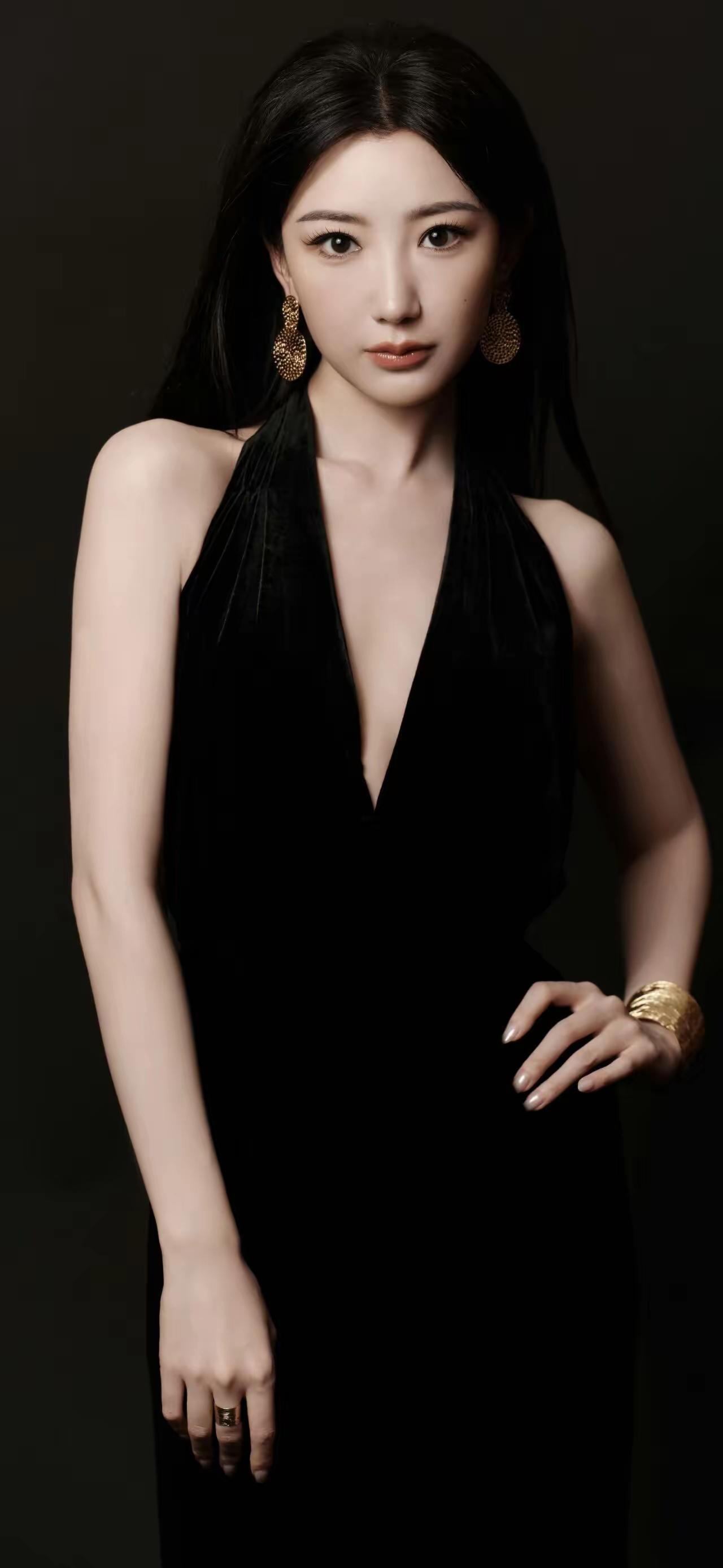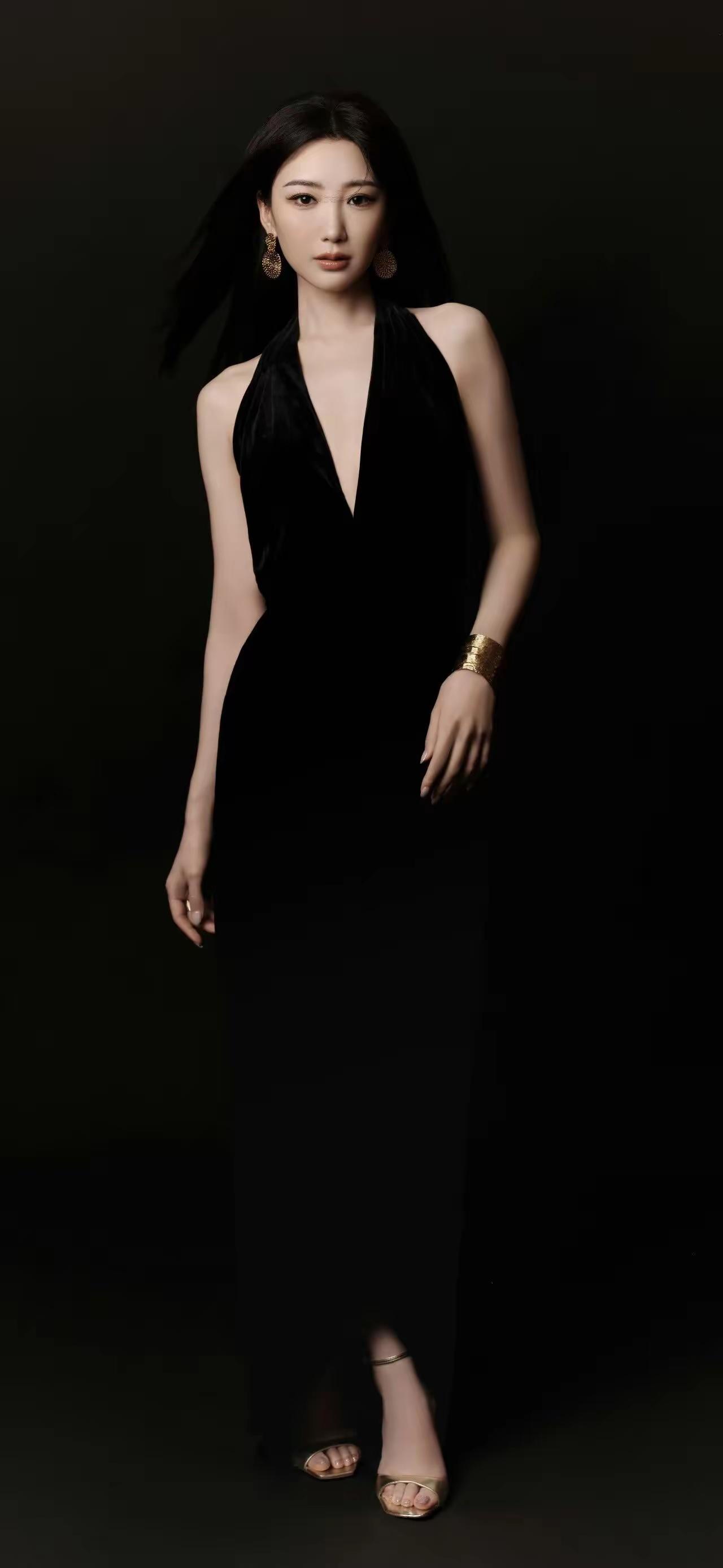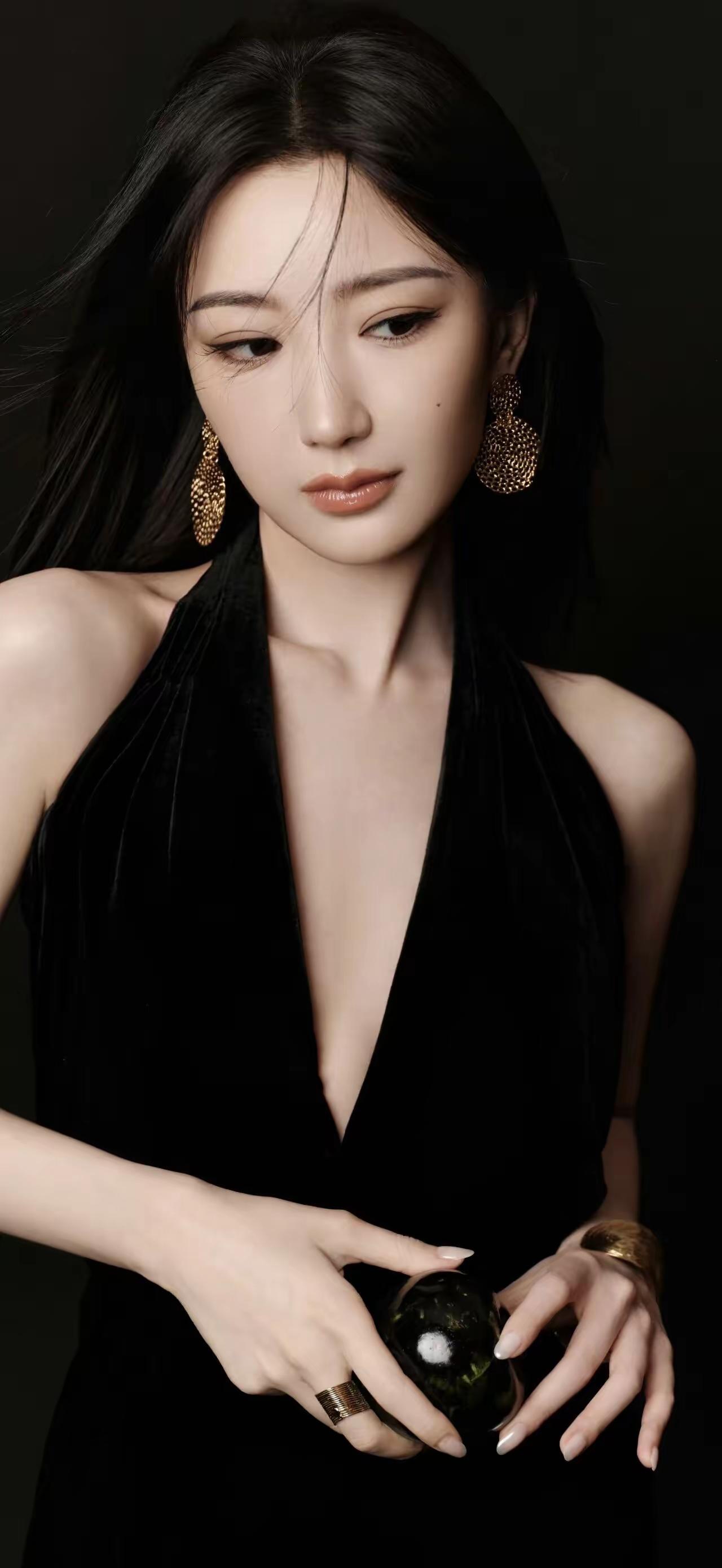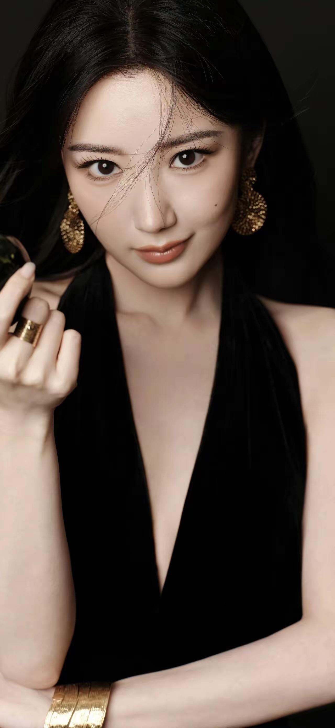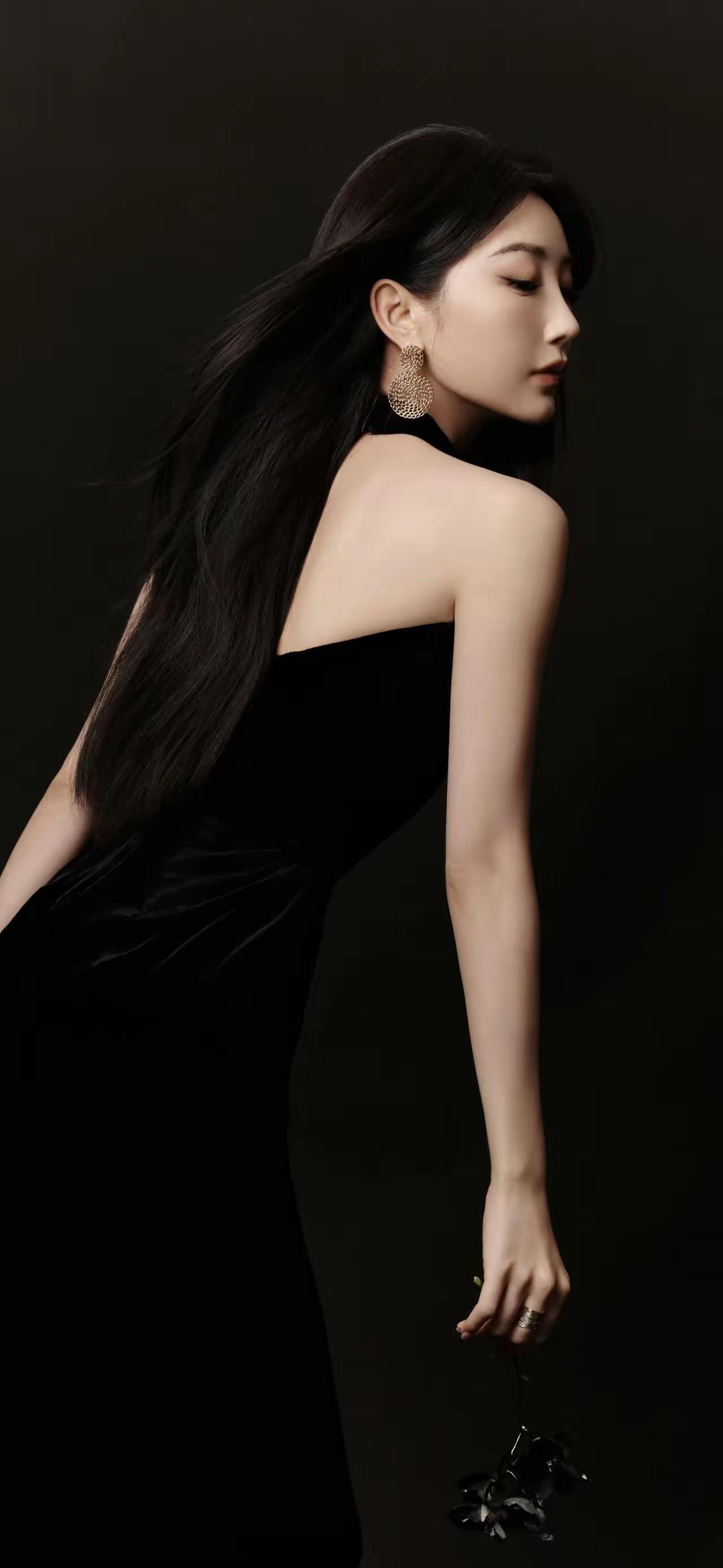 美女壁纸~毛晓彤,丝绒黑裙勾勒曼妙曲线,金饰点缀更添贵气锋芒,长发垂落间藏着温柔