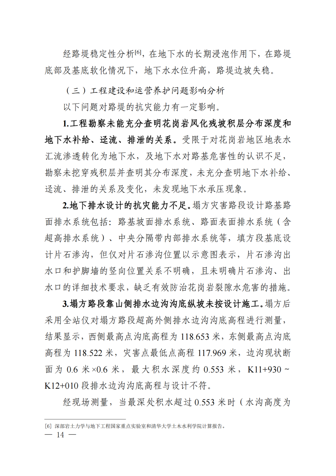 1.工程勘察未能充分查明花岗岩风化残坡积层分布深度和地下水补给、迳流、排泄的关系。受限于对花岗岩地区地表水汇流渗透转化为地下水,及地下水对路基危害性的认识不足,勘察未挖穿残积层并查明其分布深度,未充分查明地下水补给、迳流、排泄的关系及变化,未发现地下水承压现象。