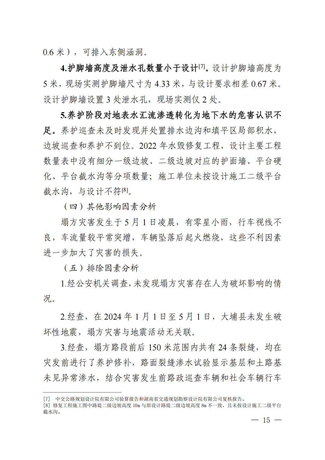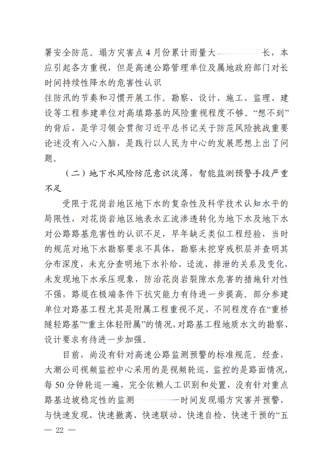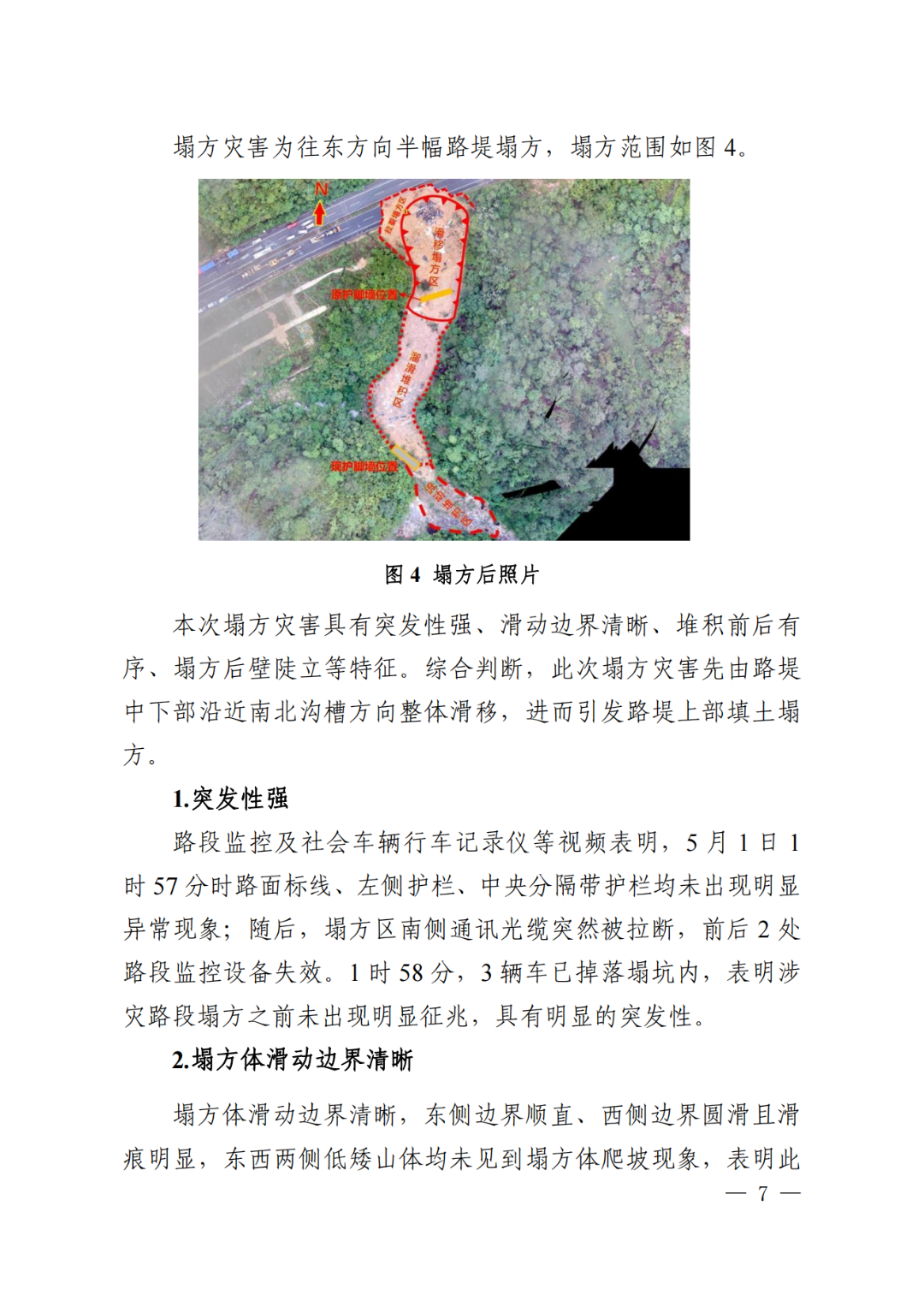 经调查认定,这是一起长时间持续性降水与多种因素叠加耦合作用,导致的特别重大人员伤亡的塌方灾害。塌方灾害发生于5月1日凌晨,有零星小雨,行车视线不良,车流量较平常突增,车辆坠落后起火燃烧,这些不利因素进一步加大了灾害的损失。同时,工程勘察、设计、施工、监理、验收、运营、养护等方面存在的问题,对路堤的抗灾能力有一定影响。