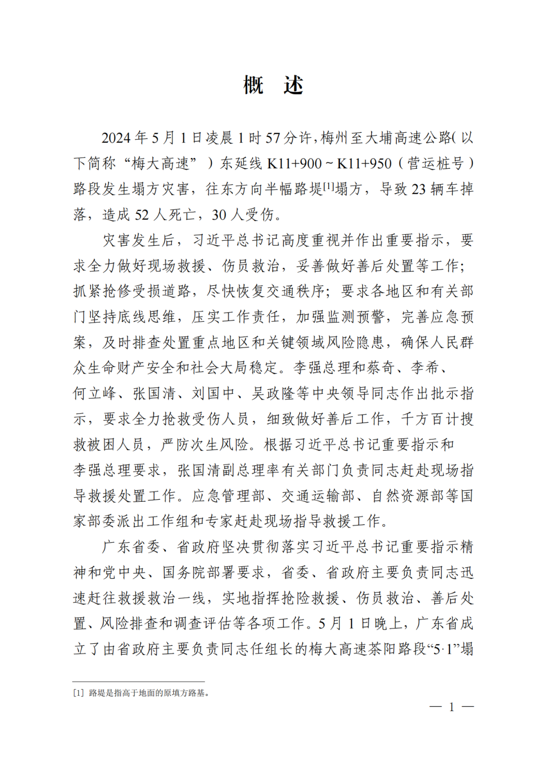 2024年5月1日凌晨1时57分许,梅州至大埔高速公路(简称“梅大高速”)东延线K11+900~K11+950(营运桩号)路段发生塌方灾害,往东方向半幅路堤塌方,导致23辆车掉落,造成52人死亡,30人受伤。