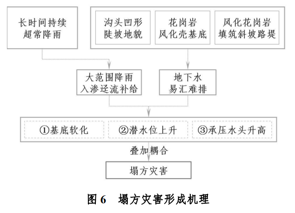 经专家技术论证,梅大高速茶阳路段“5·1”塌方灾害是一次长时间持续性降水与多种因素叠加耦合作用,导致的特别重大人员伤亡的塌方灾害。灾害点路段为“倒三角形”沟谷地貌斜坡路堤,受长时间持续性降水影响,地下水持续累积、水位升高,暂态性地下水动静水压力、浮托力和渗透力持续增大,滑动推力不断积聚,长时间饱水造成路堤底部及基底软化,抗剪强度降低,路堤中下部及护脚墙突然滑动变形,引发路堤上部填土塌方,造成高速公路塌方灾害。