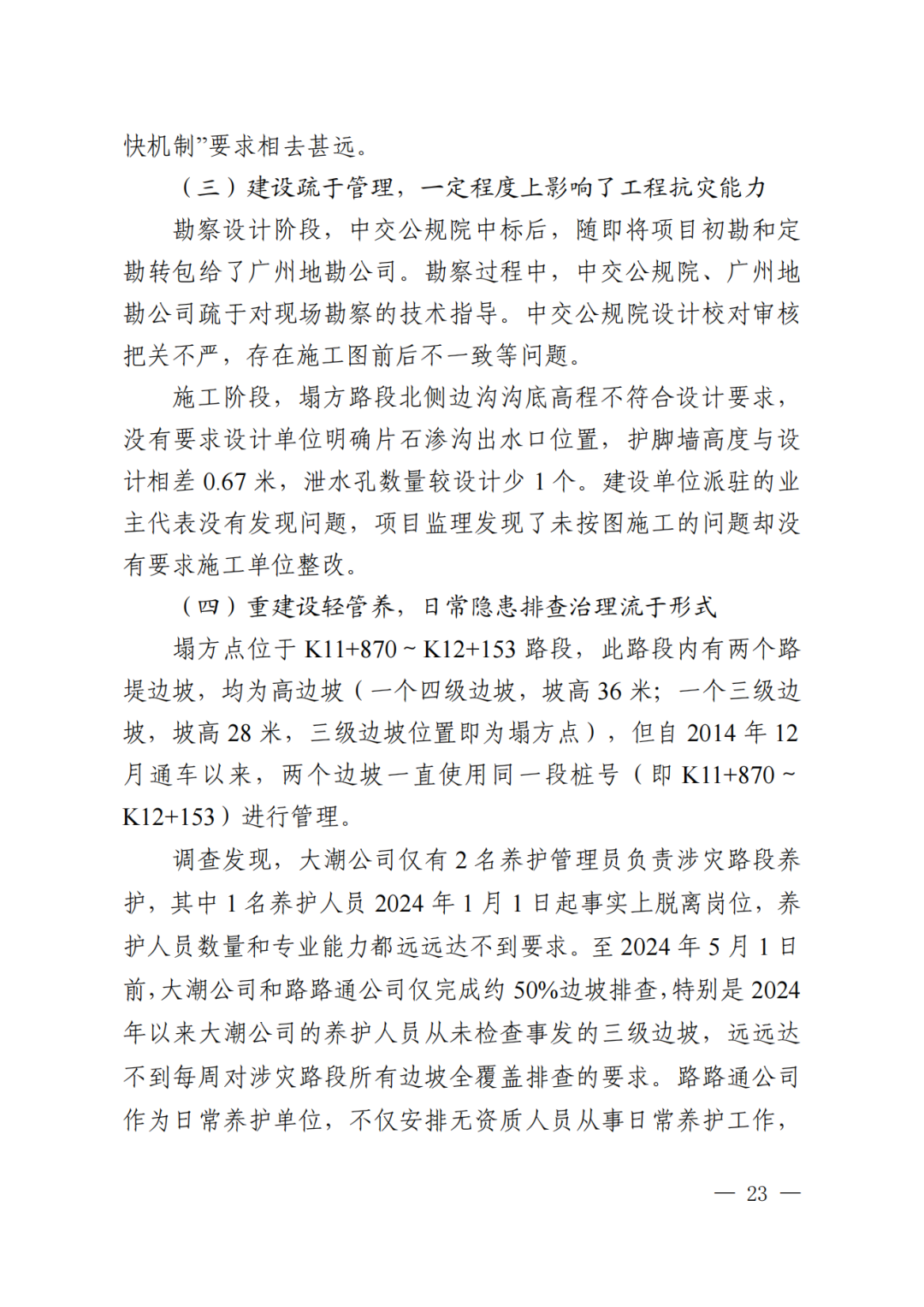运营单位广东大潮高速公路有限公司未有效督促日养单位按照合同履行日常养护职责,2022年边坡水毁修复工程竣工验收未发现施工单位未按设计施工,未在涉灾边坡建造二级平台截水沟等问题。未按有关规定落实重点边坡管控工作,未及时发现并处置涉灾路段排水沟和填平区局部积水问题。