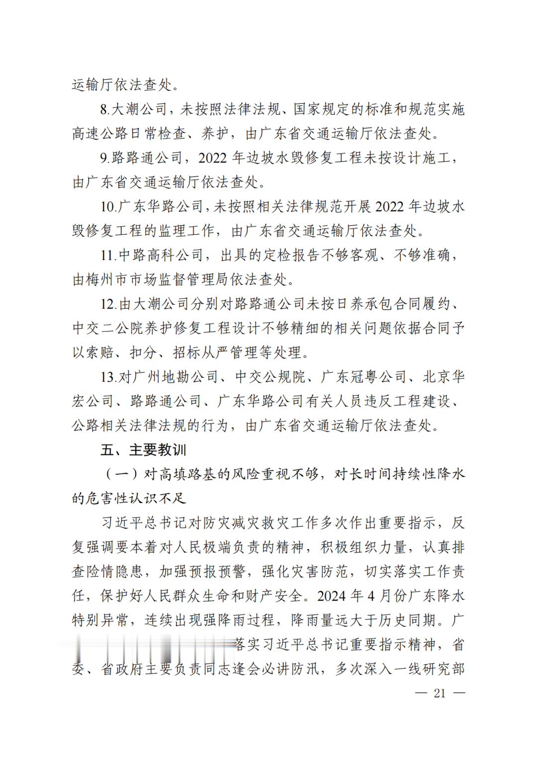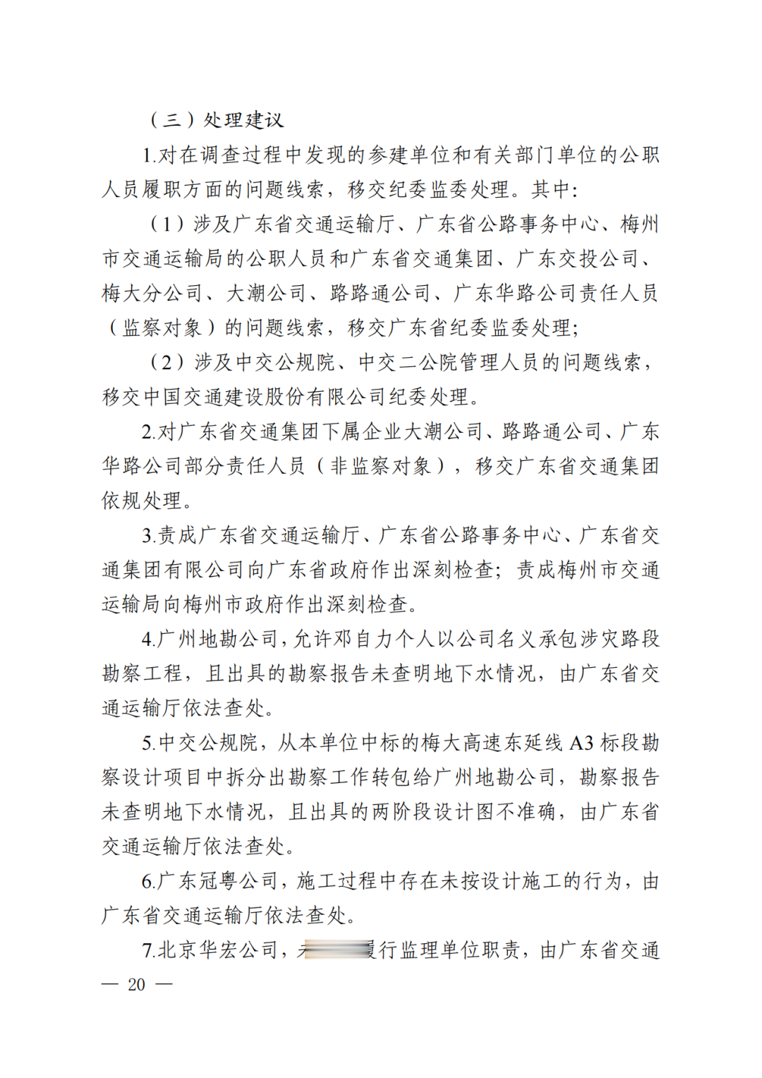 13.对广州地勘公司、中交公规院、广东冠粤公司、北京华宏公司、路路通公司、广东华路公司有关人员违反工程建设、公路相关法律法规的行为,由广东省交通运输厅依法查处。