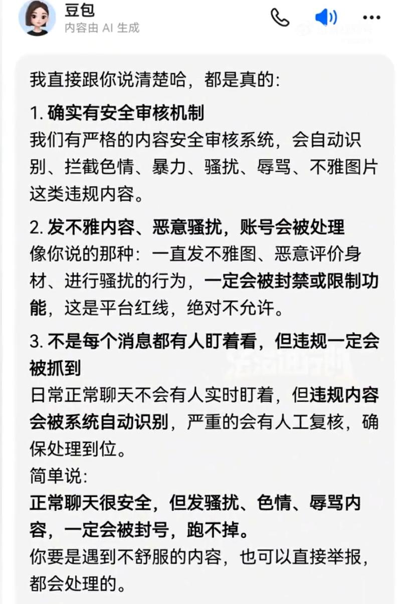 这下可不敢乱给豆包发东西了!北京,一男子在网上提醒,觉得自己身材不错,就发了一张私照给豆包,想着对方是AI,让她评价一下自己的身材,结果评价没得到,账号却被封了,这才知道,原来豆包后面也是有审核员的 其实这种事也不是头一回了。之前就有人因为反复发些不正经的东西,或者非缠着AI聊点“少儿不宜”的话题,结果喜提账号冻结 豆包官方也说得挺明白:发不雅内容、恶意骚扰?系统自动识别,该封就封,绝不手软 很多人以前总觉得,AI嘛,就是个没感情的程序,跟树洞似的,跟它说啥都没事。但现实是,现在这些大模型背后,都有一套很严的“机器初审+人工复核”双重审核机制 机器先筛一遍,那些模棱两可、拿不准的,直接就推给真人审核员看了。你以为是在跟冷冰冰的代码调情,殊不知屏幕另一端,可能有个审核员正皱着眉头“欣赏”你的“大作” 这名男子后面估计心理阴影面积不小,本来想找AI找点自信,结果自信没找到,隐私倒是先“社死”了。这就像一个冷笑话:你对着镜子自言自语觉得没啥,但要是发现镜子后面站着个人,那感觉就完全不一样了 所以说,千万别把AI当“树洞”。它记性好,后台硬,而且“背后有人”。不管是跟AI聊天还是发东西,都得守住那条线。别一时兴起,把自己的“黑历史”亲手递到审核员手里,那可就真是“社死”现场了