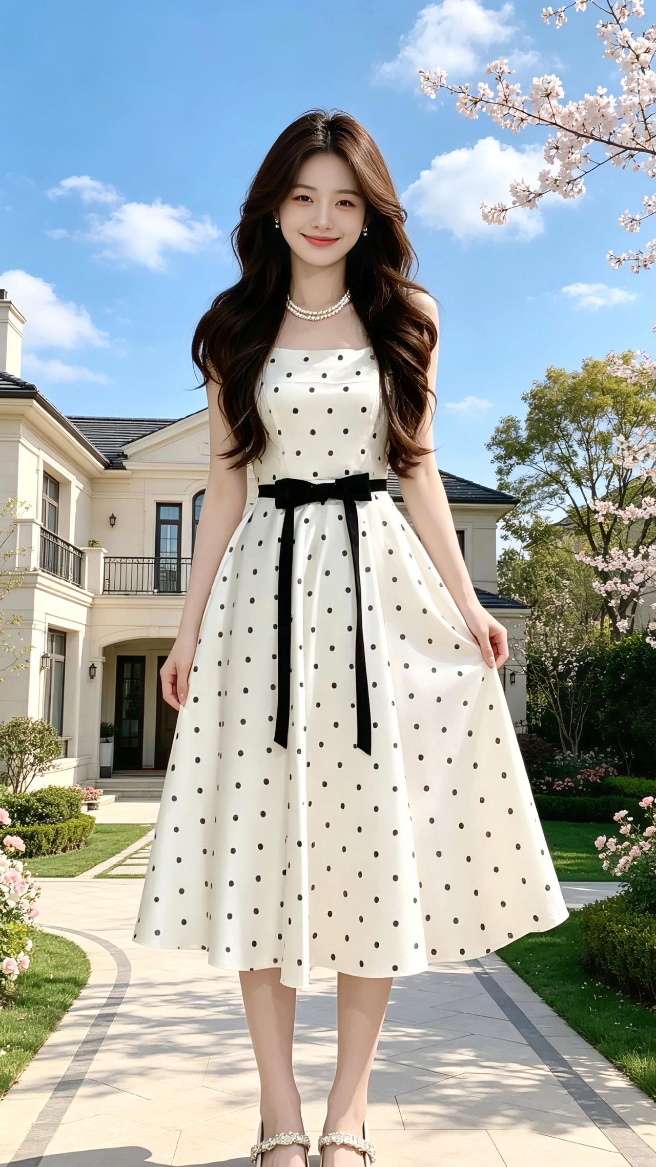 波点裙与春日序章 风把春日揉成了温柔的信笺,落在米白色的波点裙摆上,每一个黑圆点,都藏着一整个季节的浪漫。 她站在别墅前的花径上,长发被春风吹得微微扬起,珍珠项链在阳光下闪着细碎的光,像把银河揉碎了戴在颈间。腰间的黑色蝴蝶结轻轻垂落,随着抬手提裙的动作,漾开一圈又一圈温柔的涟漪。短款的裙摆是少女的灵动,中长的裙摆在风里舒展,是轻熟的优雅,同一件波点裙,在不同的姿态里,晕开了两种截然不同的春日风情。 樱花在枝头开得热烈,粉白的花瓣落在肩头,落在青草地,落在铺着石板的小路上。远处的别墅在蓝天与白云下静立,蔷薇在墙角肆意盛放,空气里满是草木与花香的清甜。她倚着石栏,或是提裙而立,每一个瞬间,都成了春日里最动人的帧。 波点是永不褪色的经典,就像春日永远不会缺席的浪漫。这条裙子,藏着少女的心事,也装着轻熟的温柔,在春日的庭院里,在樱花的芬芳里,在每一个被阳光亲吻的瞬间,演绎着属于春天的、永不落幕的优雅。 早春穿搭 高级感穿搭 随时随地挑战看秀穿搭 套装