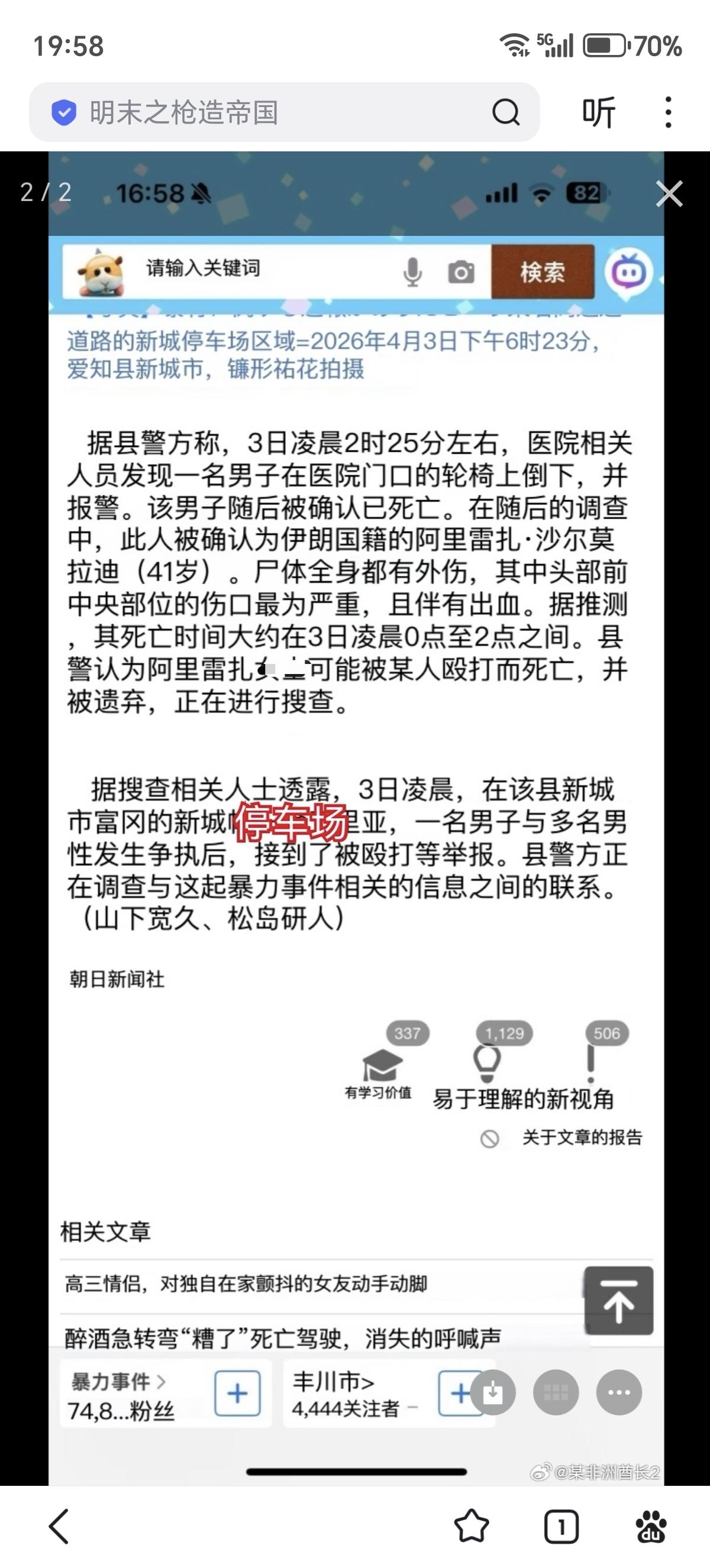 昨天有个41岁的伊朗籍男子被人抛尸在爱知县丰川市民医院,遗体全身有遭殴打痕迹,警