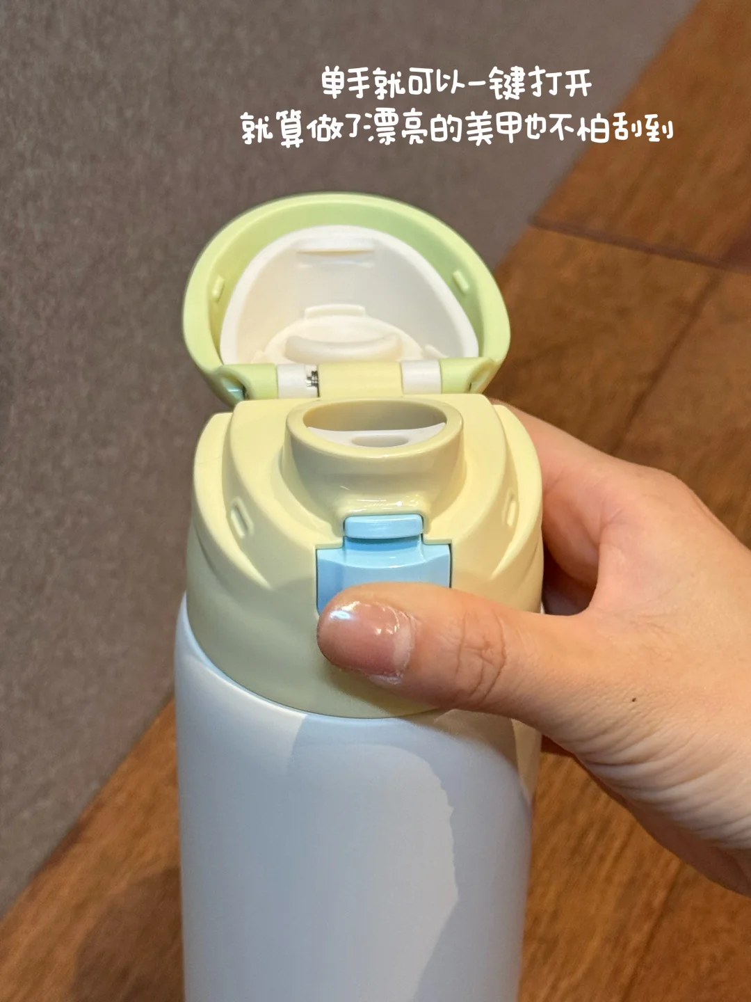 单手就可以一键弹盖打开,喝水不费力很方便