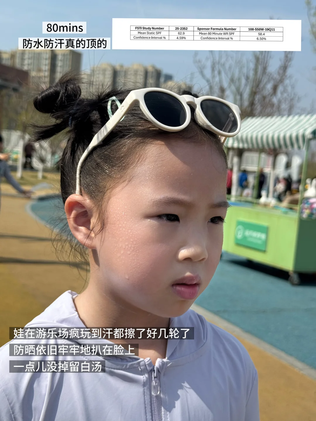 Fotisheer防晒膜科技是真牛,80分钟超长防水防汗💦追泡泡、跑滑梯,玩得满头大汗也还是干干净净的,只有小汗珠,一点都不花脸