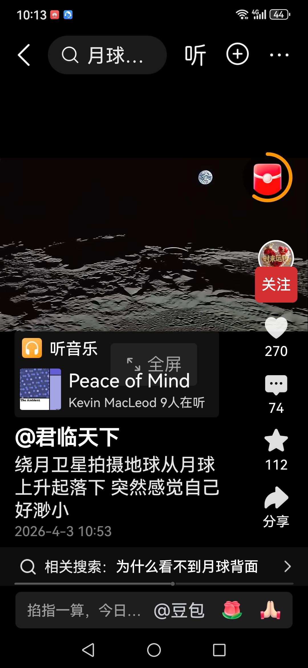 我们习惯从地球上看月亮,像玉盘,像月牙儿。玉兔,嫦娥奔月的传说印象深刻。随着科技的进步,绕月卫星使我们有幸从月球上看我们生活居住的地球一一蓝色星球。我们深深的感到自己的渺小。浩瀚宇宙等待着我们去探索,奥妙无穷。