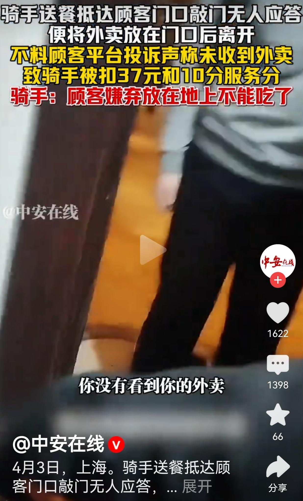 太气人了,这哪是没收到外卖,这就是明摆着讹人、欺负外卖小哥! 4月3日,上海。一位外卖骑手准时把餐送到顾客家门口,敲了半天门,屋里一点动静都没有。 骑手没办法,只能按照平台流程,把外卖放在门口,拍了照片留证,然后就离开了。 结果转头,骑手就收到了平台的处罚通知:顾客投诉未收到外卖,直接扣了骑手37元餐费,还扣了10分服务分! 骑手当时就懵了,赶紧联系顾客,上门对质。 监控里,骑手对着顾客质问:“我敲门了,你开门的时候,门口明明就有你的外卖!” 结果顾客的话,直接刷新了所有人的底线,顾客说:“我不知道是不是我的呀!我在家呀!没人给我!你交到我手上了吗?放地上不能吃了!” 骑手气不过,当场怼了回去:“那我敲门你为什么不开门?” 顾客还嘴硬:“我开了!前后不到两秒钟我就开门了!” 骑手直接戳穿谎言:“两秒钟?那你的意思我还能飞了是吧?两秒钟你这里开门,我这里外卖刚放下,我能飞哪去?” 顾客还在那胡搅蛮缠:“我这里下不去,外卖放地上我怎么拿?” 合着人在家,听见敲门故意不开,就等骑手走了,转头就投诉没收到,想白嫖一顿饭!被骑手找上门,不仅不心虚,还编出“两秒开门”的瞎话,倒打一耙嫌外卖放地上脏了不能吃! 骑手辛辛苦苦跑一单,赚的还没这37块多,就因为顾客的恶意投诉,不仅白干,还得倒贴钱,服务分被扣,以后接单都受影响! 网友评论炸锅,全是愤怒和心疼! 有的网友说:真的太气人了!这种恶意投诉的顾客就该拉黑封号!骑手敲门没人应,放门口留证,凭什么扣骑手的钱?平台就是助纣为虐! ​ 也有的网友说:我真服了!人在家故意不开门,转头就投诉没收到,这不就是诈骗吗?为了一顿饭脸都不要了!还编两秒开门的瞎话,脸都不要了! ​ 还有的网友说:太心疼骑手了!风里来雨里去,赚点辛苦钱,还要被这种无赖坑!平台就不能好好审核一下吗? ​ 更有的网友说:别拿“放地上不能吃”当借口!你自己点的餐,骑手送到门口,你不开门是你的问题!恶意投诉就该重罚! 看完这个事,我真的气得浑身发抖! 现在总有人把外卖骑手当软柿子捏,觉得自己是顾客就可以为所欲为!人在家,听见敲门故意装死,看着外卖放门口,转头就投诉没收到,想白嫖一顿饭,这不是无赖是什么?这就是明晃晃的诈骗! 更让人恶心的是,顾客被骑手找上门,不仅不心虚,还编出“两秒开门”的离谱谎言,倒打一耙嫌外卖放地上脏了。 那你倒是开门啊!你不开门,骑手能怎么办?撬你家门吗?两秒钟开门,合着骑手会飞?刚放下外卖就瞬间消失?这种鬼话也就骗骗平台的机器人审核! 骑手跑一单,赚的就是几块钱跑腿费,37块钱,可能是骑手跑两三单才能赚回来的钱!10分服务分,更是直接影响骑手的收入和评级!就因为顾客的一句恶意投诉,骑手的辛苦全白费了! 平台呢?就只会和稀泥,不管青红皂白,先扣骑手的钱!从来不会站在骑手这边,帮骑手维权!这种“顾客就是上帝”的歪风邪气,什么时候才能刹住? 骑手不是你的佣人,不是你可以随意欺负的工具人!恶意投诉、白嫖外卖,就是在透支整个行业的善意! 我们尊重每一份职业,更尊重每一份辛苦付出。外卖骑手的每一分钱,都是用汗水换来的,不是给你这种无赖白嫖的! 恶意投诉从来不是维权,是诈骗;顾客至上从来不是纵容,是底线。别让辛苦的人寒心,别让无赖的人得逞! 对此,你怎么看? 信息来源:中安在线