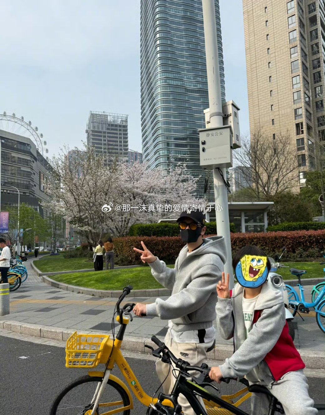 黄晓明晒和儿子春日骑行照黄晓明小海绵骑行照一转眼小海绵长高不少,和爸爸并肩骑行