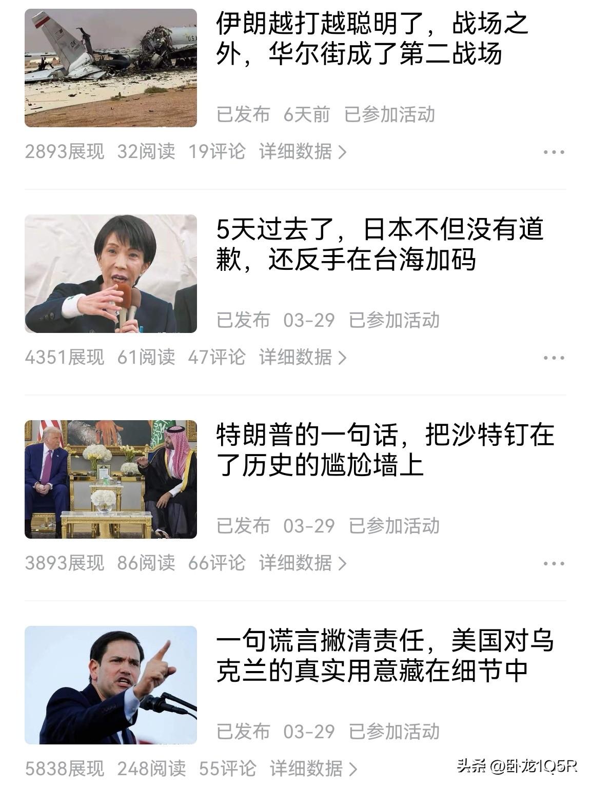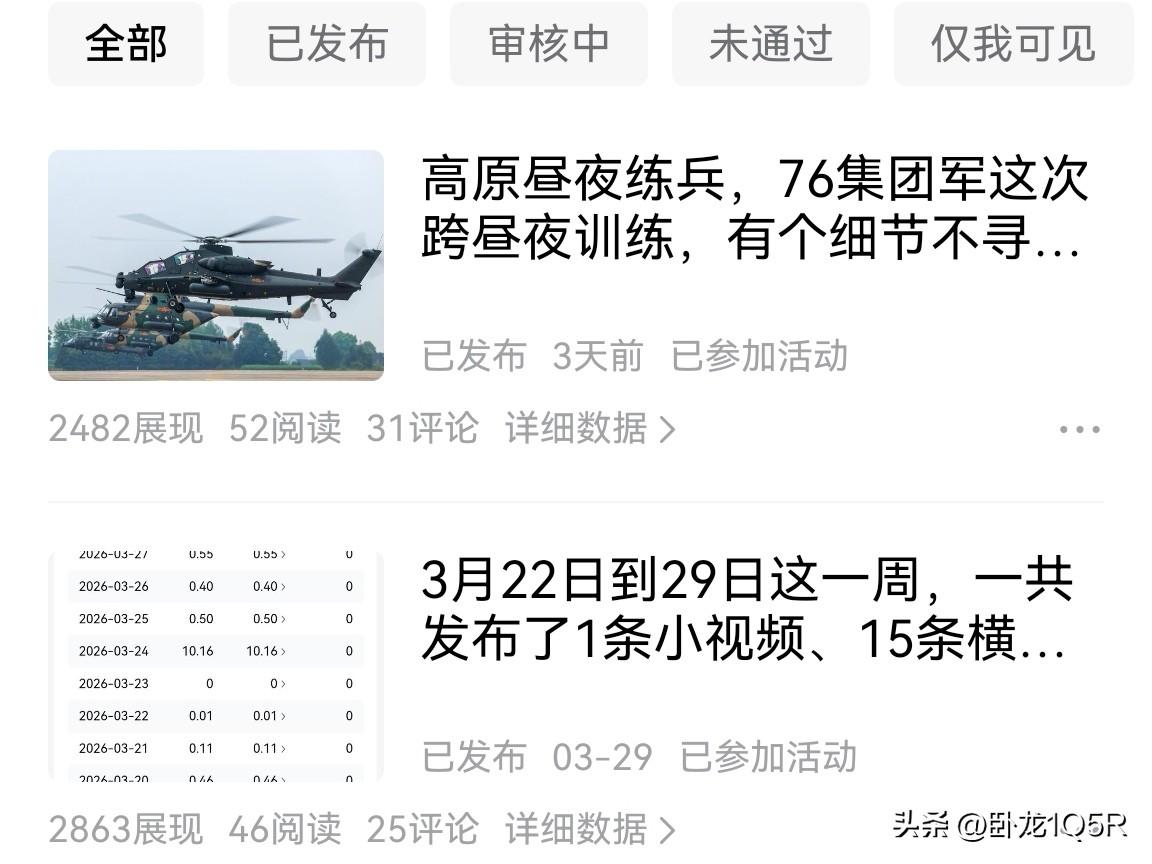 3月29日到4月4日这一周,一共发布了1个小视频、4个横屏视频、15篇文章、2篇微头条,粉丝39613。坚持每天更新内容,写了不少,本周最终收益只有4.53元,所有收益都来自这些创作内容,没有其他额外收入,创作与收益情况如实记录,下周继续更新收益。