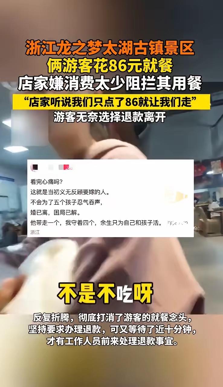 浙江湖州,一位游客在太湖古镇逛累了,随便找了家餐馆坐下,点了86块钱的菜。还没等动筷子,店员就板着脸过来了:“点这么少,才86块,我们不做。”硬生生把人往外赶。游客愣住了,明码标价的店,吃饭还要看钱多钱少?最后只能退款走人,心里堵得慌。视频传到网上,网友炸了锅:“86块不是钱?”事情闹大后,景区和商家都采取了措施。 这事儿发生在4月1号,太湖某度假区里的演艺城。两位游客逛累了,想简单吃点,赶晚上六点的演出。他们点了两道菜,两份米饭,加起来86块。钱不多,但填饱肚子足够了。 店员一看单子脸色就不好看了,话里话外嫌弃点得太少,“差点事”,“没法做生意”。游客被说得莫名其妙,菜谱上明码标价,我按自己饭量点,有什么问题?他们提出退款,店员又改口说能吃。来回拉扯,时间耽误了,看演出的心情也没了。 视频传到网上大家都看不下去了,86块钱在景区吃个便饭,再正常不过。两个人点两个菜,合情合理。商家这副“钱少不伺候”的嘴脸,让人心寒。这不是明摆着变相设置最低消费吗?店里又没挂牌子说必须消费满多少,凭什么看人下菜碟? 4月4号演艺城发了公告,承认商户存在违规经营行为,损害了游客权益。他们对涉事商家做了严肃处罚,责令立即整改,还主动联系游客道了歉。游客接受了道歉,这事儿才算有个交代。 表面看是店员不会说话,根子上是经营思路出了问题。景区里租金高,商家都想尽快回本,这能理解。但把急功近利写在脸上,赶走眼前“消费低”的客人,砸的是自己的招牌,更是整个景区的口碑。一个游客败兴而归,他回去会怎么说?网上发个视频,影响的可能是成百上千个潜在游客的选择。 旅游本来就是出来放松心情的,一顿糟糕的体验往往让人难以忘记。商家算计着桌均消费,游客感受的却是人情冷暖。今天你嫌86块少,明天可能连86块的生意都没得做。 景区得想想怎么管住商户这种短视行为,比如明确禁止任何形式的拒客和变相最低消费,让游客敢放心的消费,能自己按需点餐。 做生意不能只看眼前利益,要把客人当衣食父母,而不是当“行走的提款机”,路才能走得长远,好口碑不是一天两天能积累起来的。 各位读者你们怎么看?欢迎在评论区讨论。