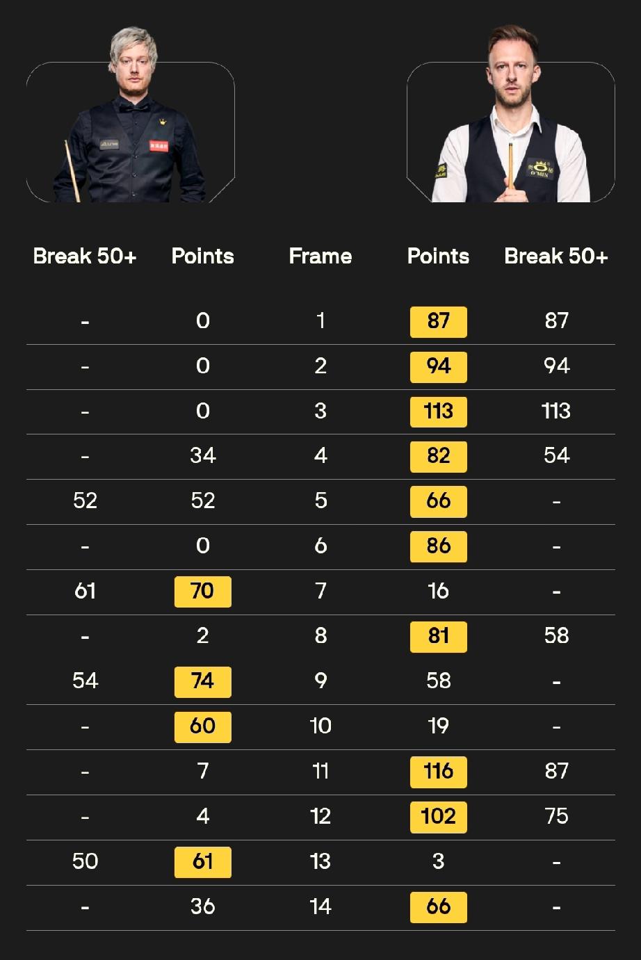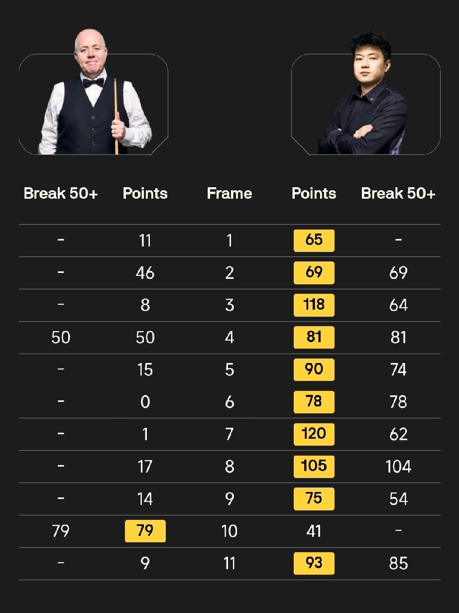 赵心童与特鲁姆普会师决赛! 4月5日凌晨,斯诺克巡回锦标赛半决赛结束。特鲁姆普10-4战胜罗伯逊、赵心童10-1击败希金斯,晋级决赛。 特鲁姆普开局六连鞭!全场一杆破百六杆50+;赵心童开局九连鞭!全场一杆破百八杆50+! 决赛赛程: 第一阶段,今晚20点,打满八局; 第二阶段,明晨2点,绝处胜负。