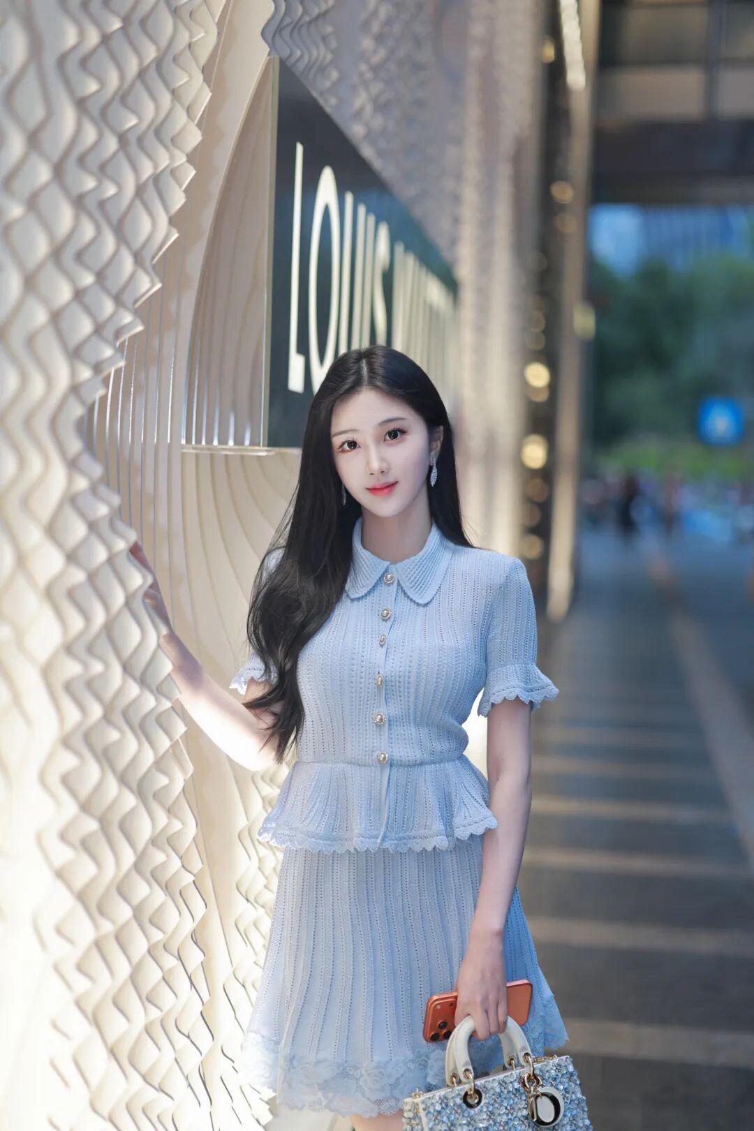 服饰细节:身着浅蓝针织连衣裙,娃娃领与荷叶边设计甜美减龄,镂空纹理精致细腻,高腰短裙勾勒出修长美腿,清新又优雅。
