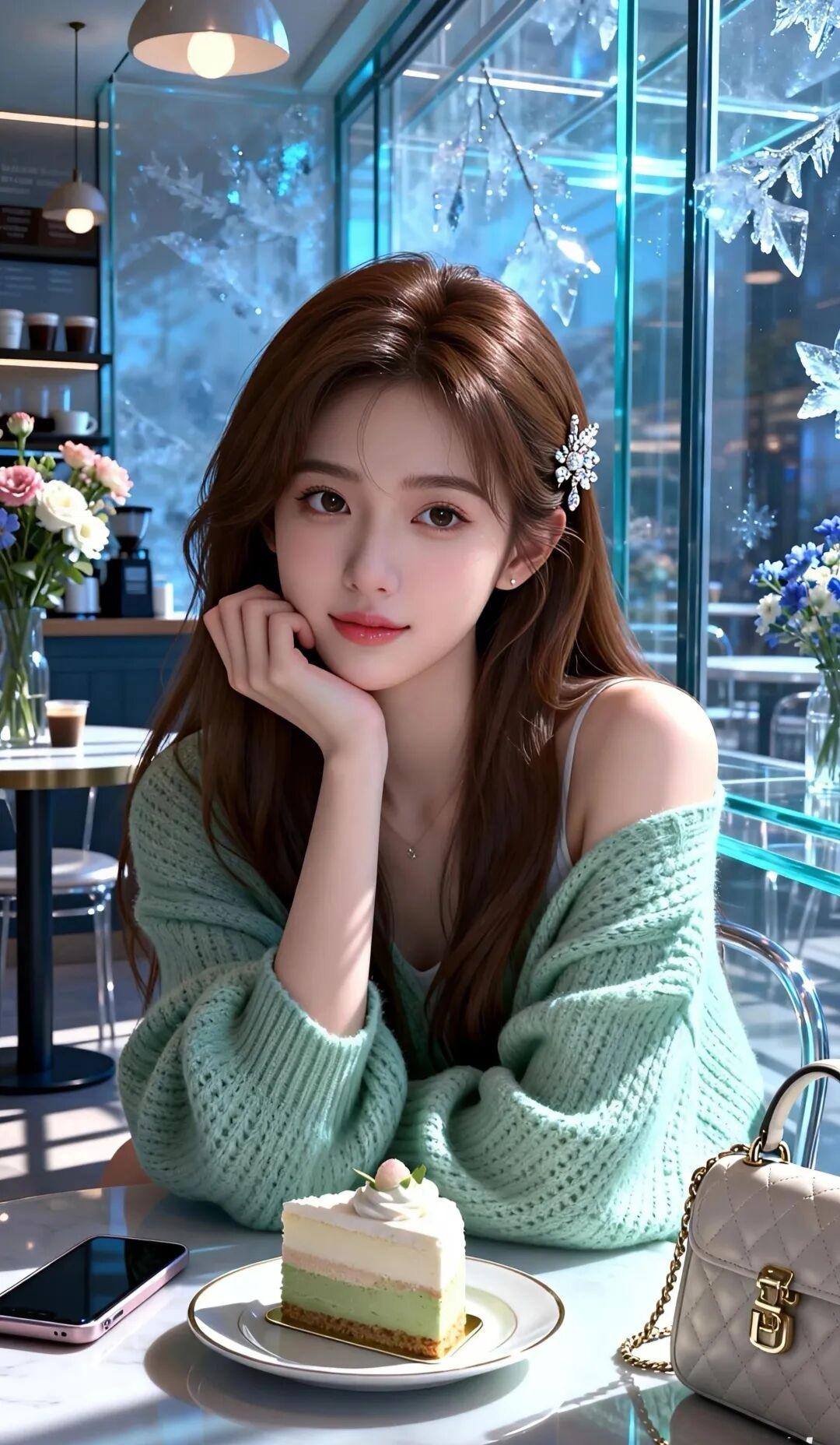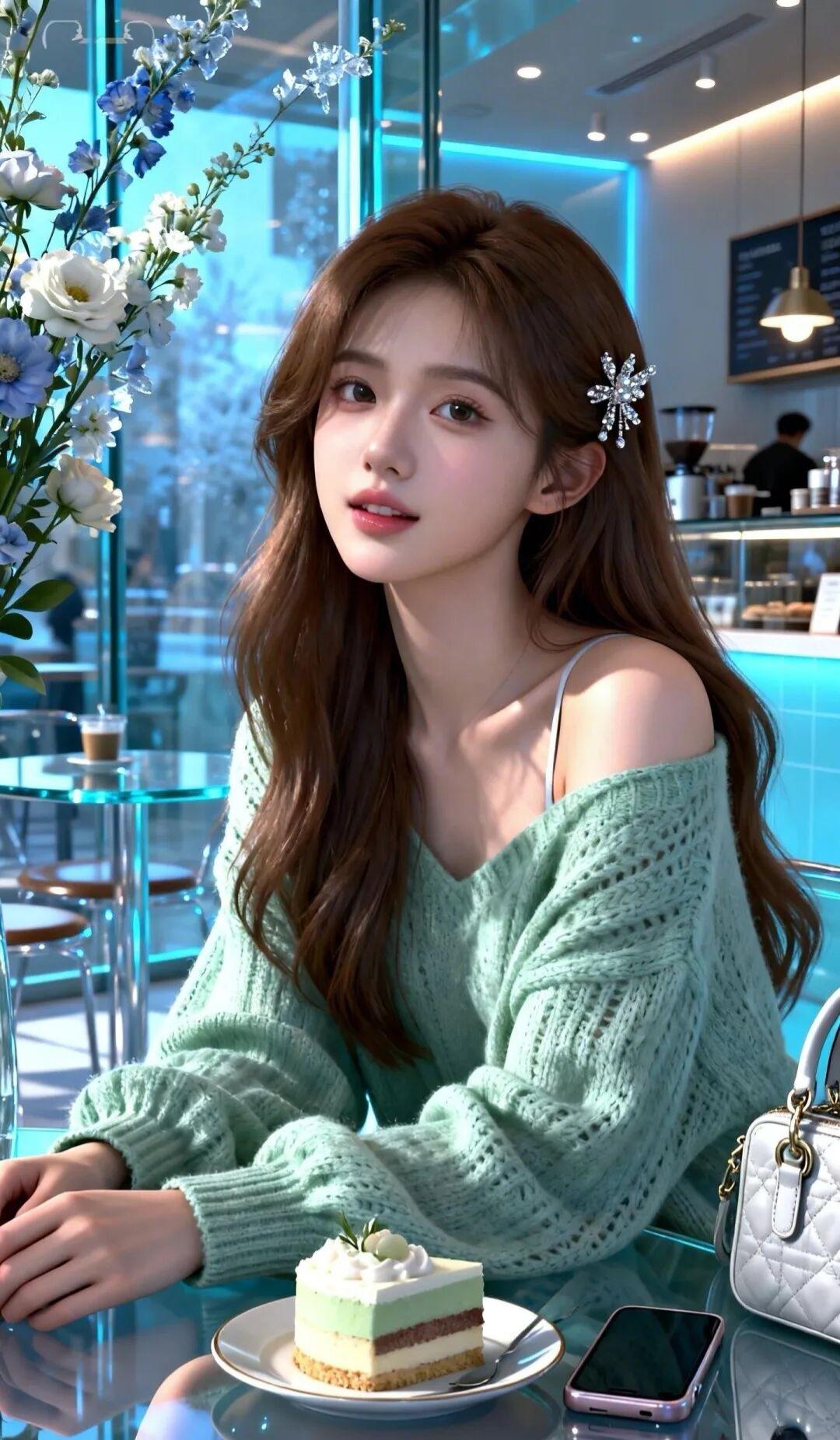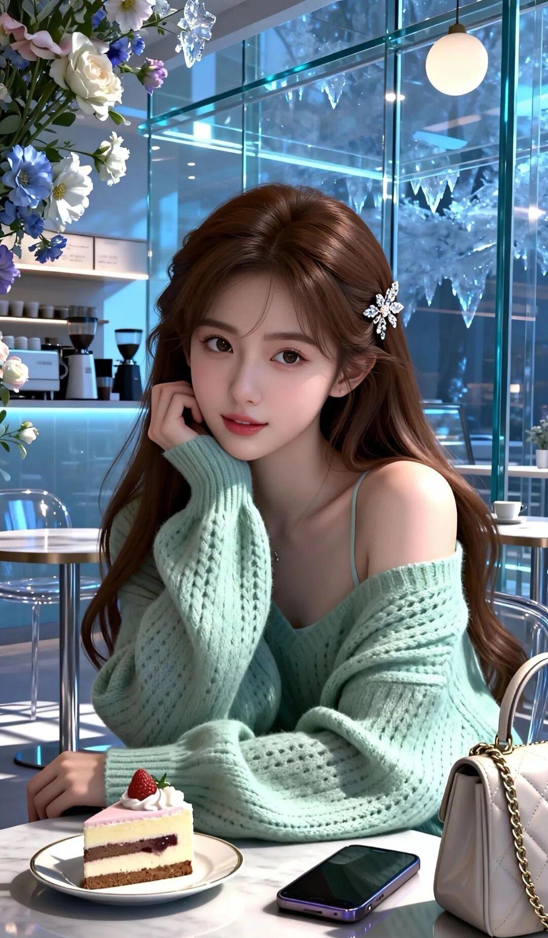 光影氛围:自然光与室内冷光交融,画面干净通透;桌上的精致蛋糕、鲜花与轻奢手袋点缀,营造出惬意的下午茶时光,满是温柔治愈的气息。