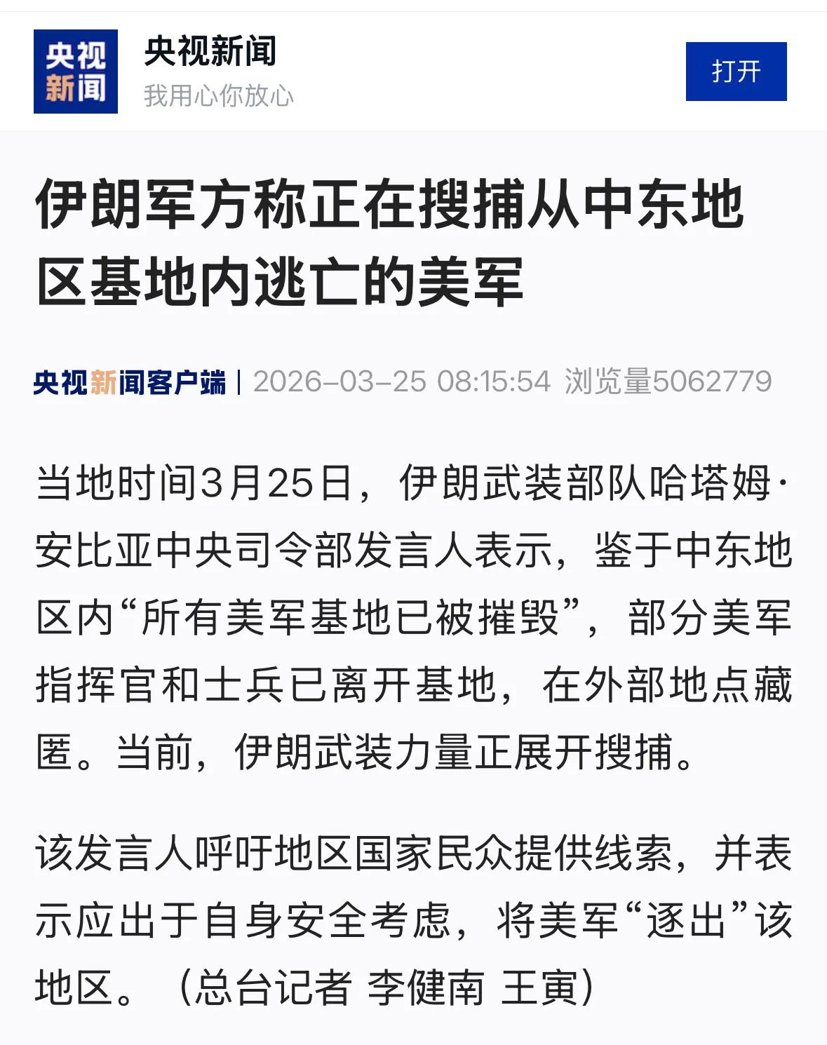 “美军试图炸死失联的飞行员”? 实在难以理解,为什么声誉卓著的新华社总是愿意转载这些离奇的伊朗方面的通讯社的内容,之前央视还转发过伊朗号召民众追拿从美军基地逃散的官兵等。 转发或援引即便不是采信也是某种背书,这一则误导受众,二则这活生生给了敌对势力说我们搞虚假宣传的口实。