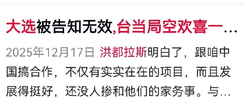 闹剧收场!洪都拉斯政客狂言挺台,台当局空欢喜一场 洪都拉斯大选在即,有参选人放出狂言,宣称若当选将恢复与台当局所谓“关系”。此话一出,台当局欣喜若狂,大肆炒作“外交突破”,妄图借此在国际上刷存在感。 但真相不容混淆。2023年洪都拉斯正式同中国建交,恪守一个中国原则,当即与台断绝所谓“邦交”,结束长达数十年的虚假关系。 这两年中洪务实合作硕果累累,农产品对华出口持续增长,中方援建项目切实改善当地民生,利益纽带根深蒂固。 此类涉台言论,不过是政客博取选票的套路。一个中国原则是国际社会普遍共识,更是中方不可逾越的红线。 任何逆潮流而动的把戏,终究是自欺欺人的闹剧,注定无法得逞。 对此,你怎么看? 一个中国原则 台海局势 洪都拉斯 台独幻想