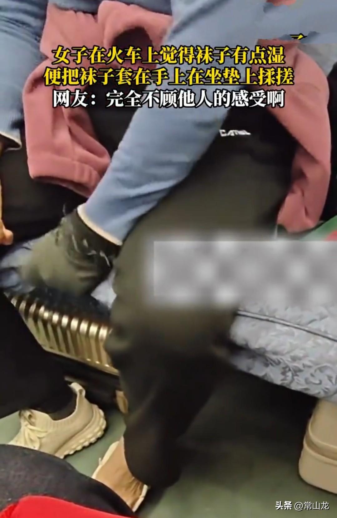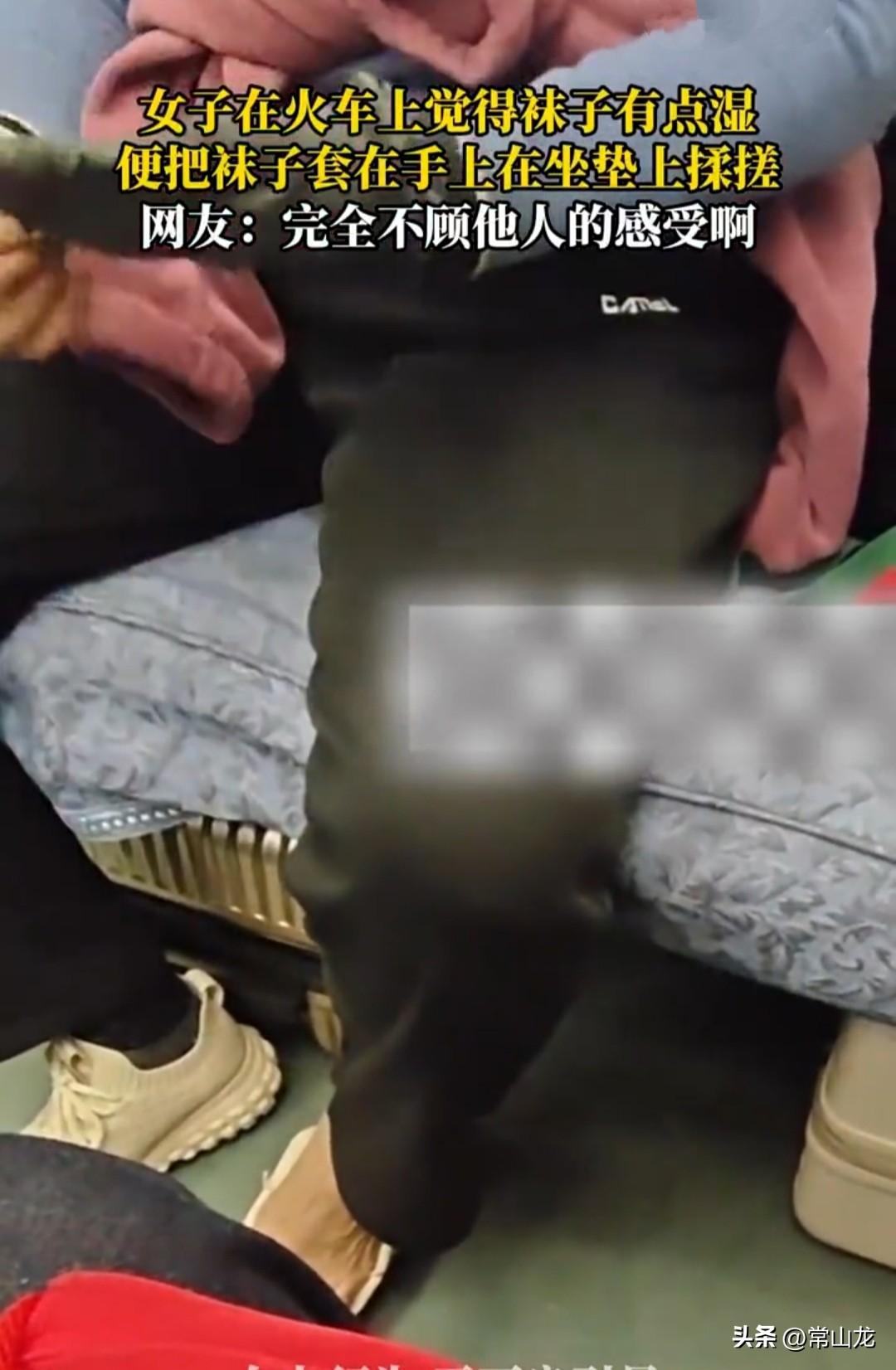 女子坐火车时觉得袜子有点湿,穿着不舒服,也不知是脚汗太重,还是进了水。 接下来女子的一个举动,让人看了三观炸裂,她将袜子脱下来套在手上,按在沙发坐垫上使劲揉搓。 此前看到一条新闻,女子因生理原因弄脏床单毯子,列车员告诉她,要么赔偿180元,要么自行清洗。女乘客说没钱,愿意自己洗,列车员给她提供了温水,还协助她清洗,在清洗过程中,女子又将另一条床单弄脏,列车员又帮她清洗,到站后女子下车自行离开,列车方面未要她任何赔偿。 那种因生理期等非故意原因弄脏卧具的,铁路部门通常不会要求赔偿。 在乘车过程中,因为呕吐、油渍等原因造成的污染属于正常范畴,清洗费用已包含在票价中。 但女子将脏袜子放在坐垫上反复揉搓,属于故意污染,这种不文明的行为不光看着恶心,还会给其他乘客带来健康风险。 袜子上的细菌、真菌、足癣会转移到坐垫上。下一个乘客直接接触,就有可能被感染。 为什么不挂在车厢内挂钩上自然风干呢? 这种情况必须要求她赔偿,而且要加倍赔偿,性质太恶劣了。