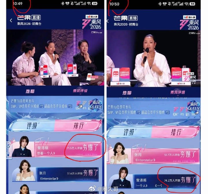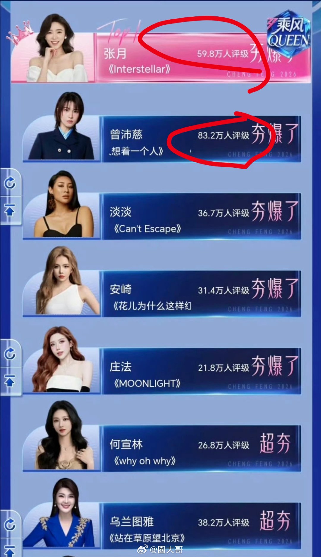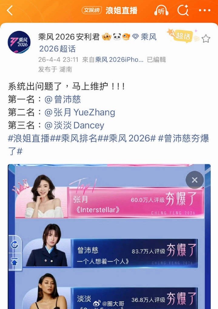 乘风2026秒删《乘风2026》的热度也夯爆了,初舞台的结果出炉后,网友热议乘风Queen的票数,张月投票人数60万,曾沛慈投票人数84万, 还有观众发现张月一分钟6万票,浪姐发博系统维护后,又秒删,这是啥情况啊……张月一分钟6万票