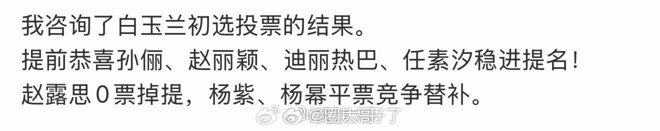 曝白玉兰初选投票结果 今年的白玉兰视后又有新消息了,曝白玉兰初选投票结果,孙俪、赵丽颖、迪丽热巴、任素汐入围白玉兰视后,杨幂杨紫平票竞争替补,赵露思无缘。如果是真的话,那也是要神仙打架了叭!曝赵丽颖迪丽热巴入围白玉兰视后